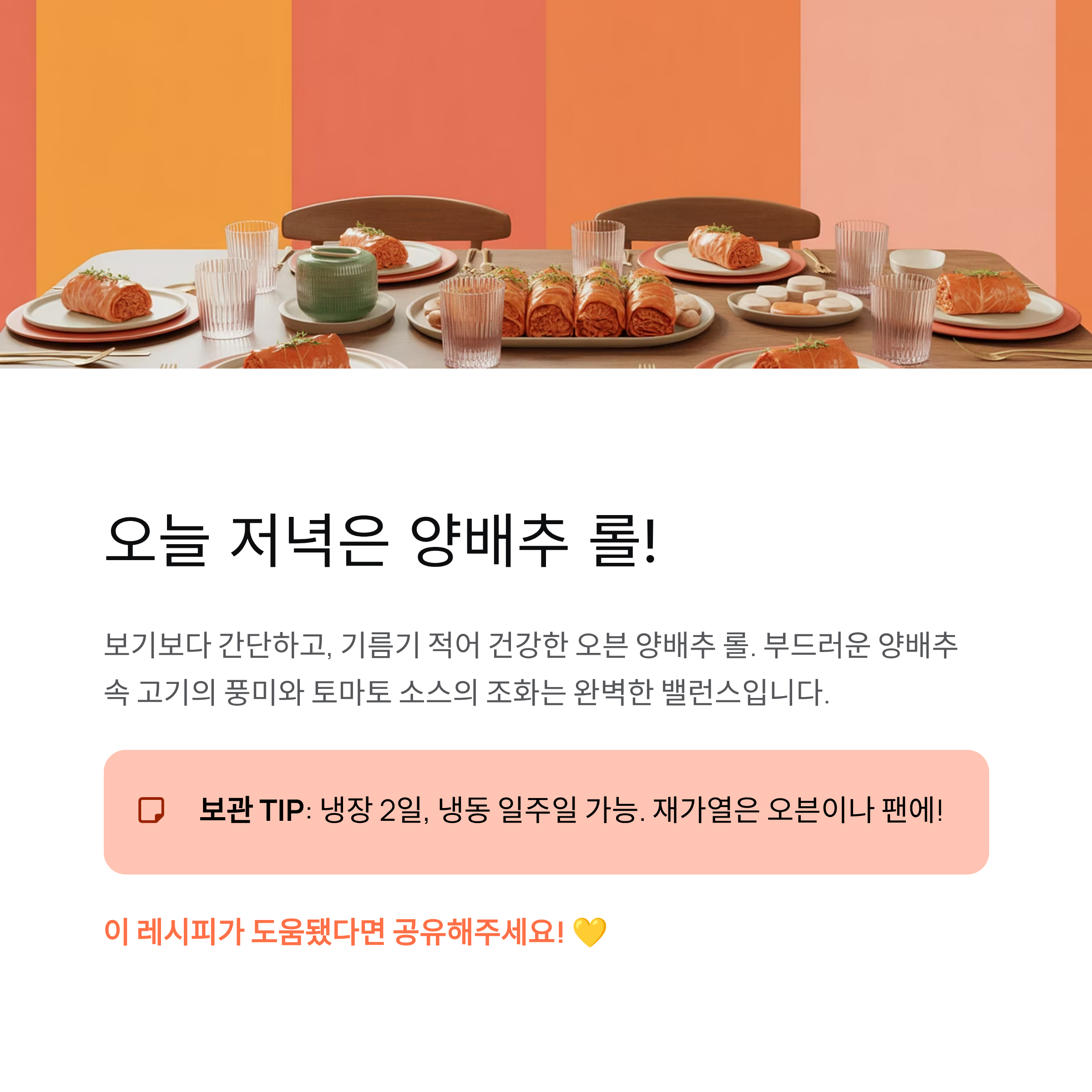 남은 양배추 롤은 냉장 보관 시 2일, 냉동 보관 시 최대 일주일까지 보관 가능합니다. 재가열할 때는 전자레인지보다 오븐이나 팬에 살짝 데워야 식감이 그대로 살아납니다.