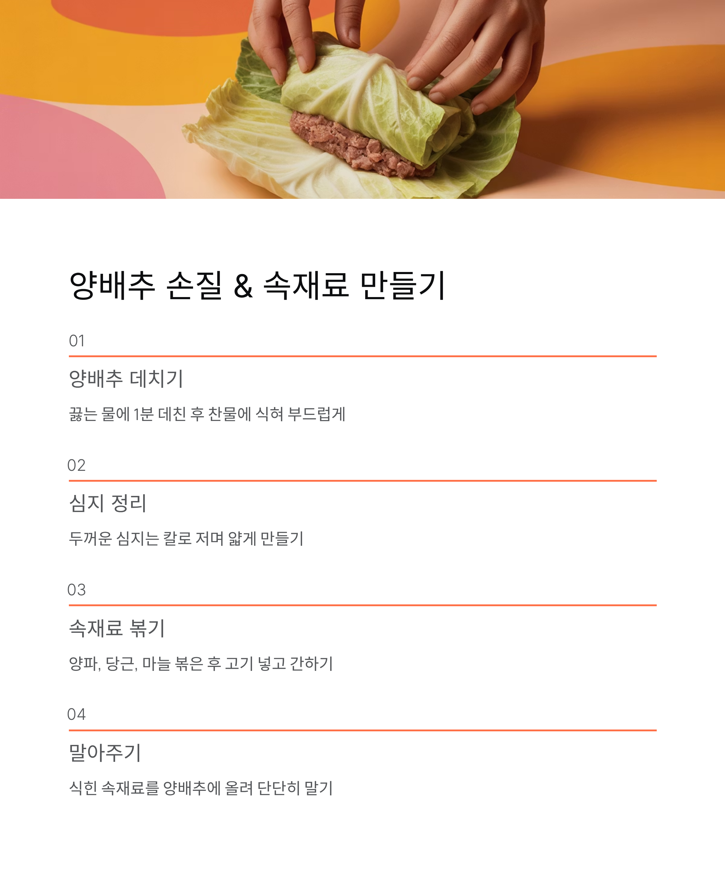양배추는 끓는 물에 1분 정도 데친 후 찬물에 담가 식혀야 합니다. 그래야 잎이 부드러워져서 쉽게 말 수 있습니다.