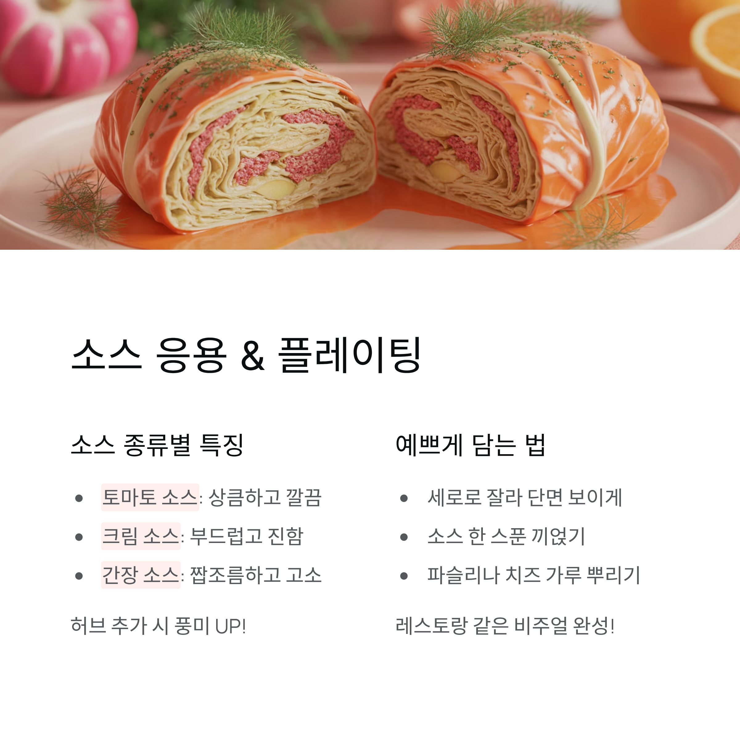 구운 양배추 롤은 접시에 세로로 잘라 담으면 단면이 예쁘게 드러납니다. 단면에 고기소와 채소가 어우러진 색감이 시각적으로도 appetizing하죠.