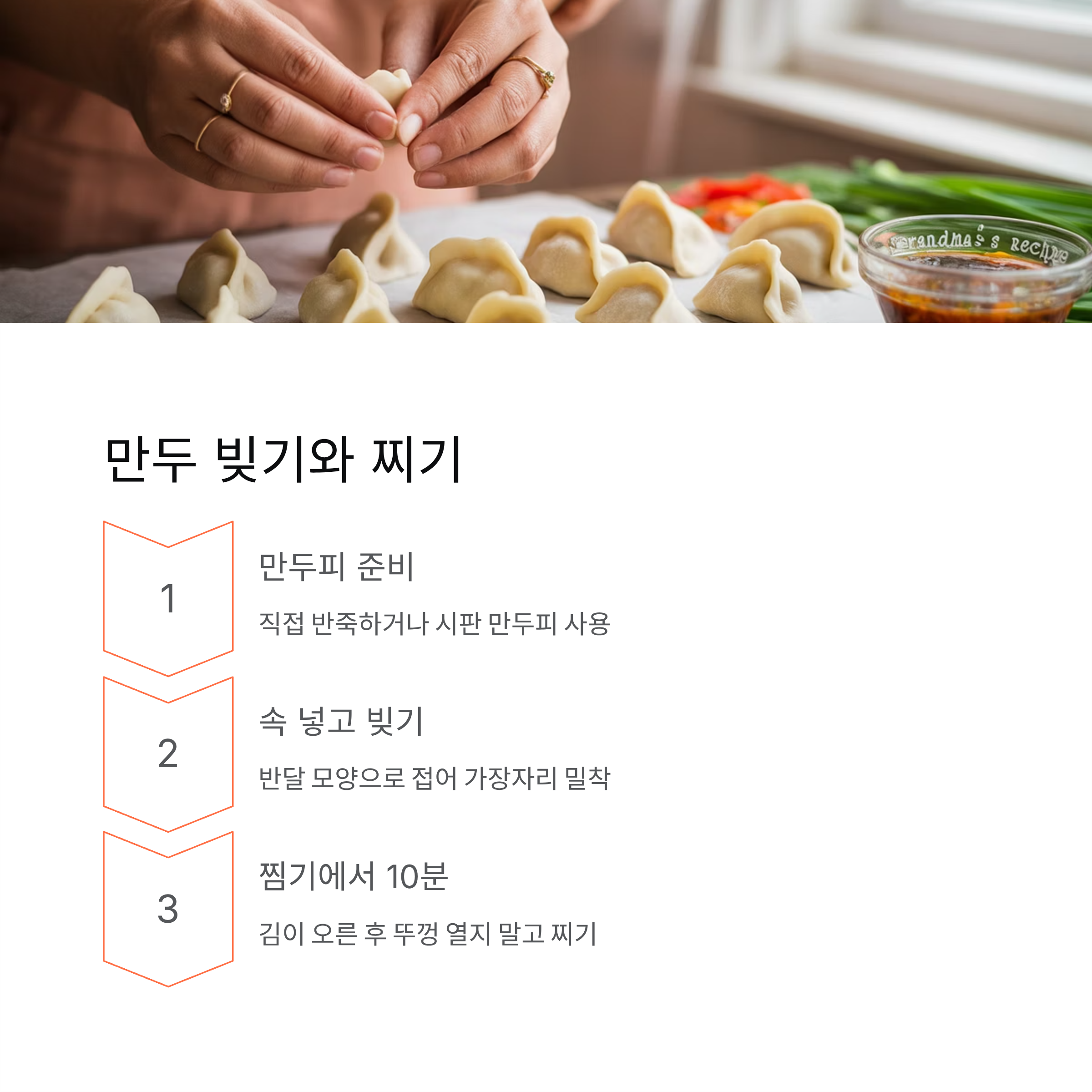 | 만두피 | 직접 반죽 또는 시판 만두피 | 가장자리 밀착 |