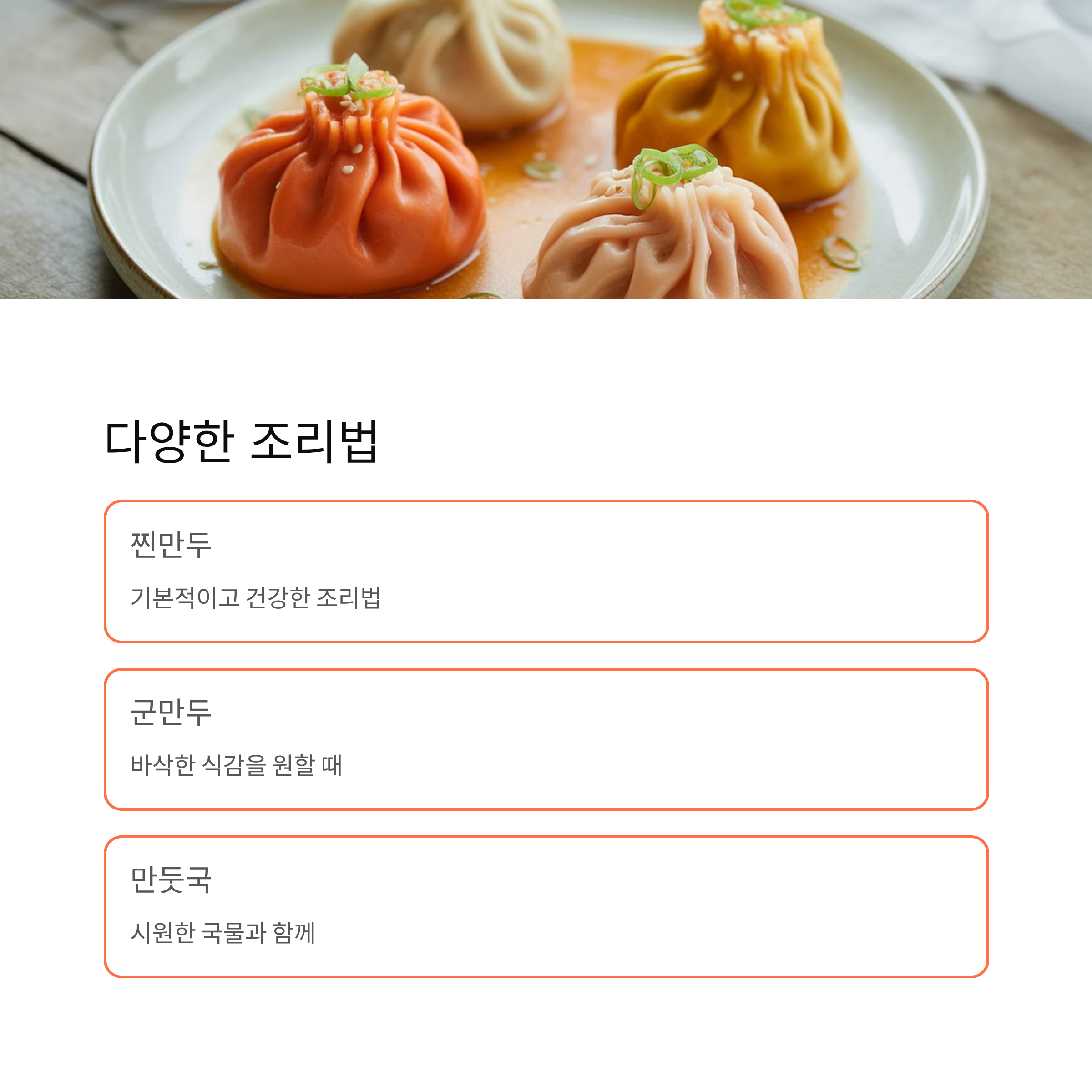 여러 가지 만두 조리법은 농촌진흥청 전통음식 자료에서 확인 가능합니다.