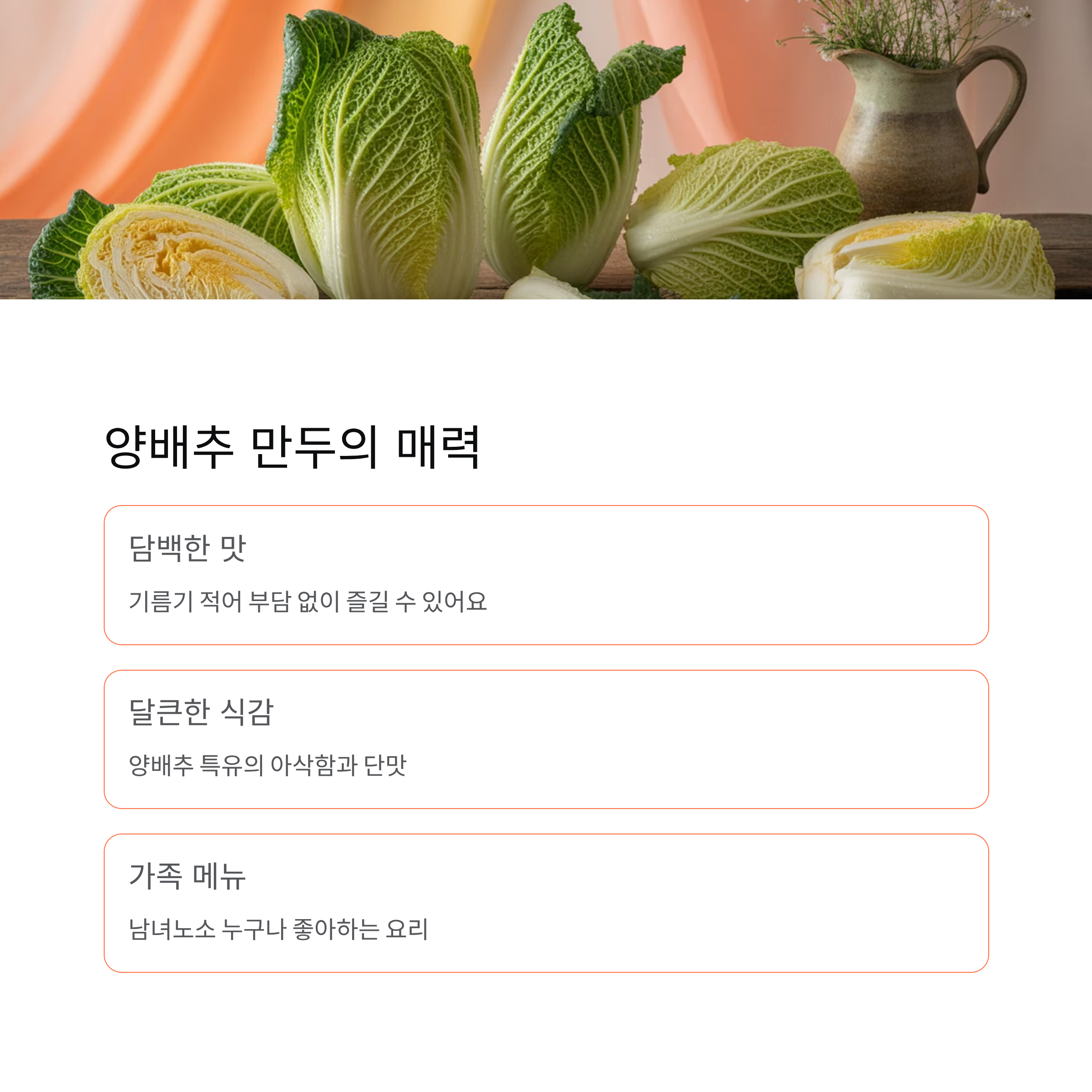 특히 양배추 만두는 담백해서 어떤 조리법에도 잘 어울리므로 여러 방식으로 응용해 보시는 것도 좋습니다.