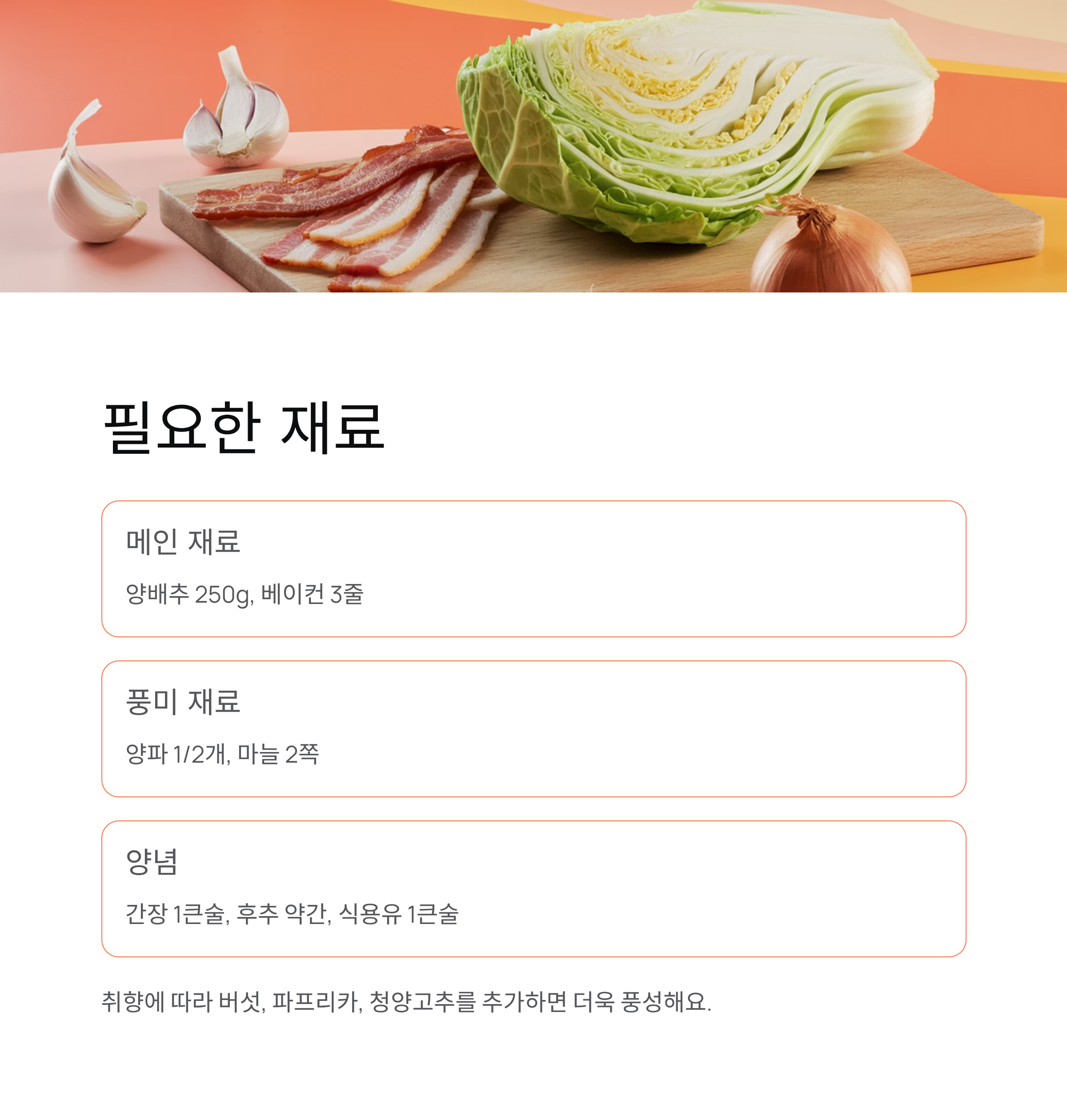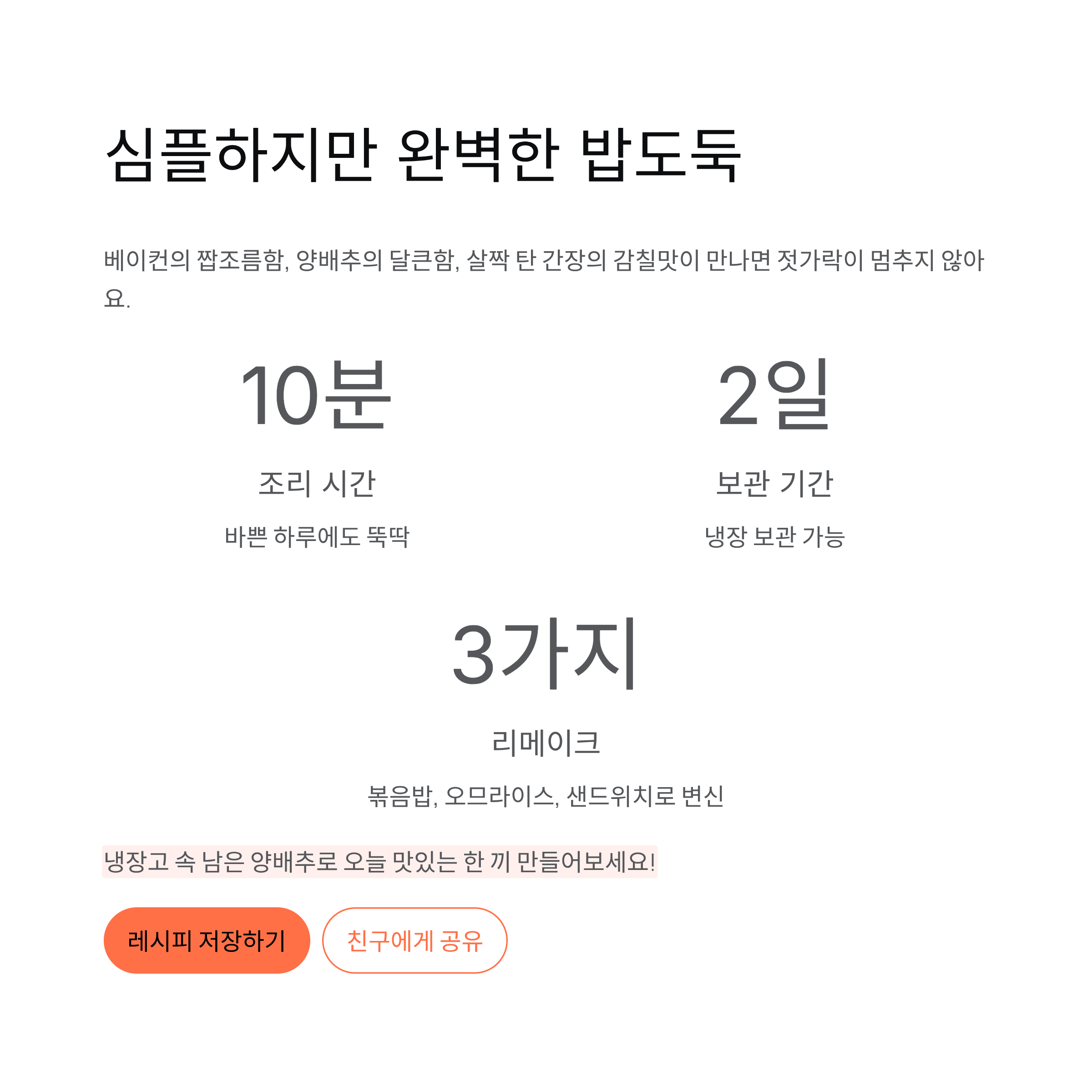 | 양배추 베이컨 덮밥 | 밥, 달걀후라이 | 고소한 한 끼 완성 |