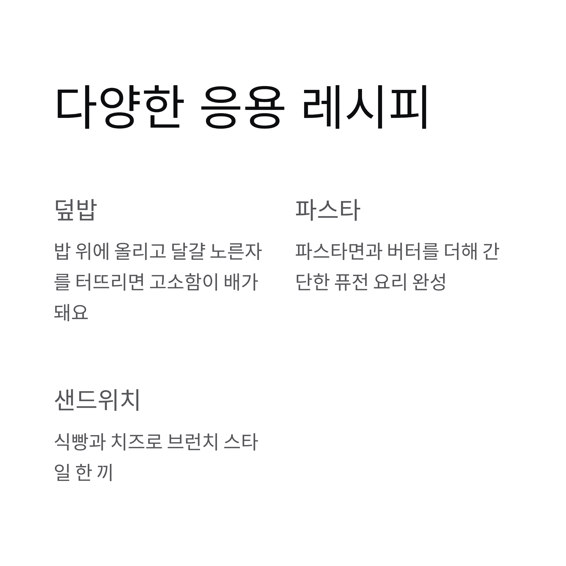 | 볶음밥 | 밥 넣고 간장 살짝 더해 볶기 |