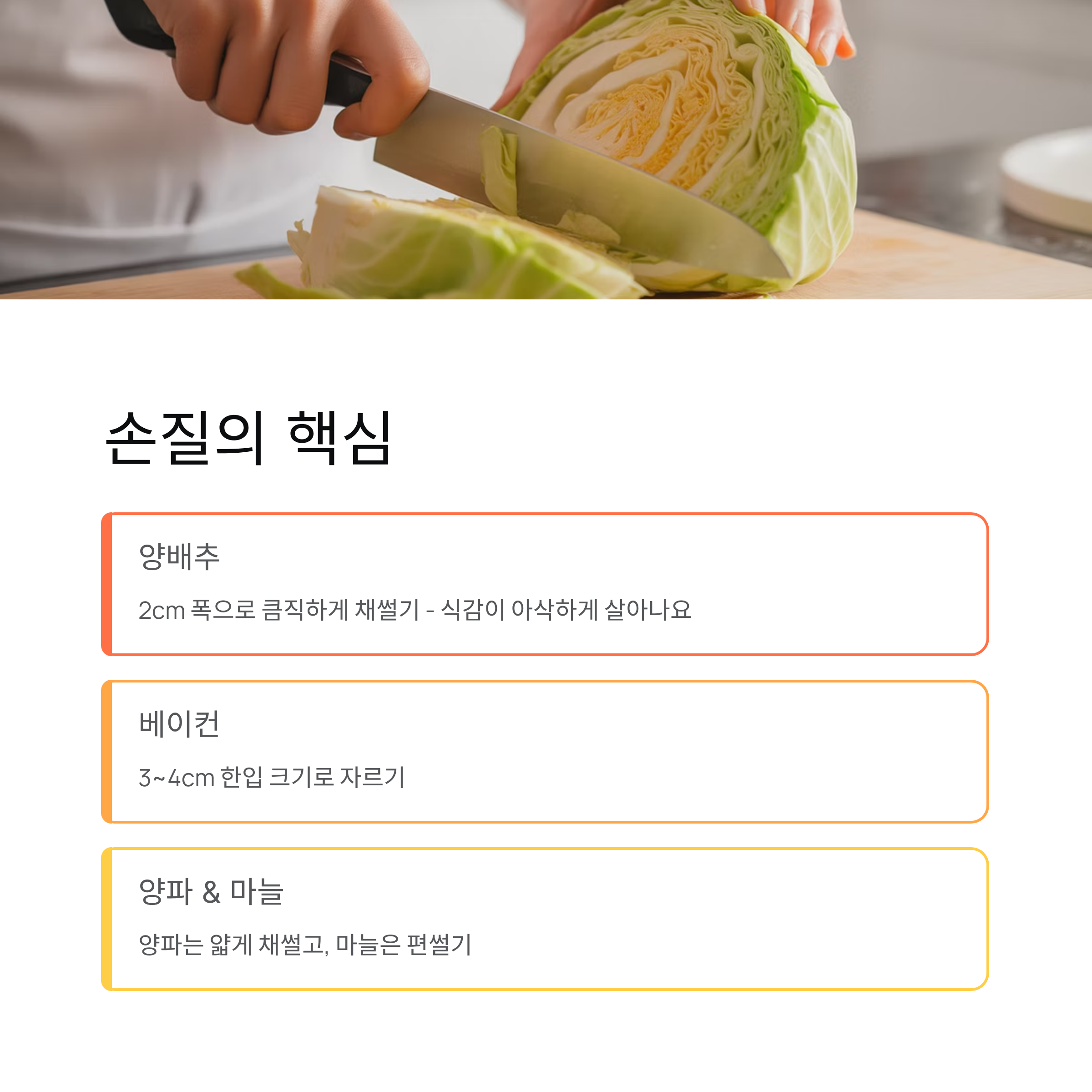 양배추는 너무 얇게 썰면 숨이 빨리 죽고 질척해질 수 있습니다.