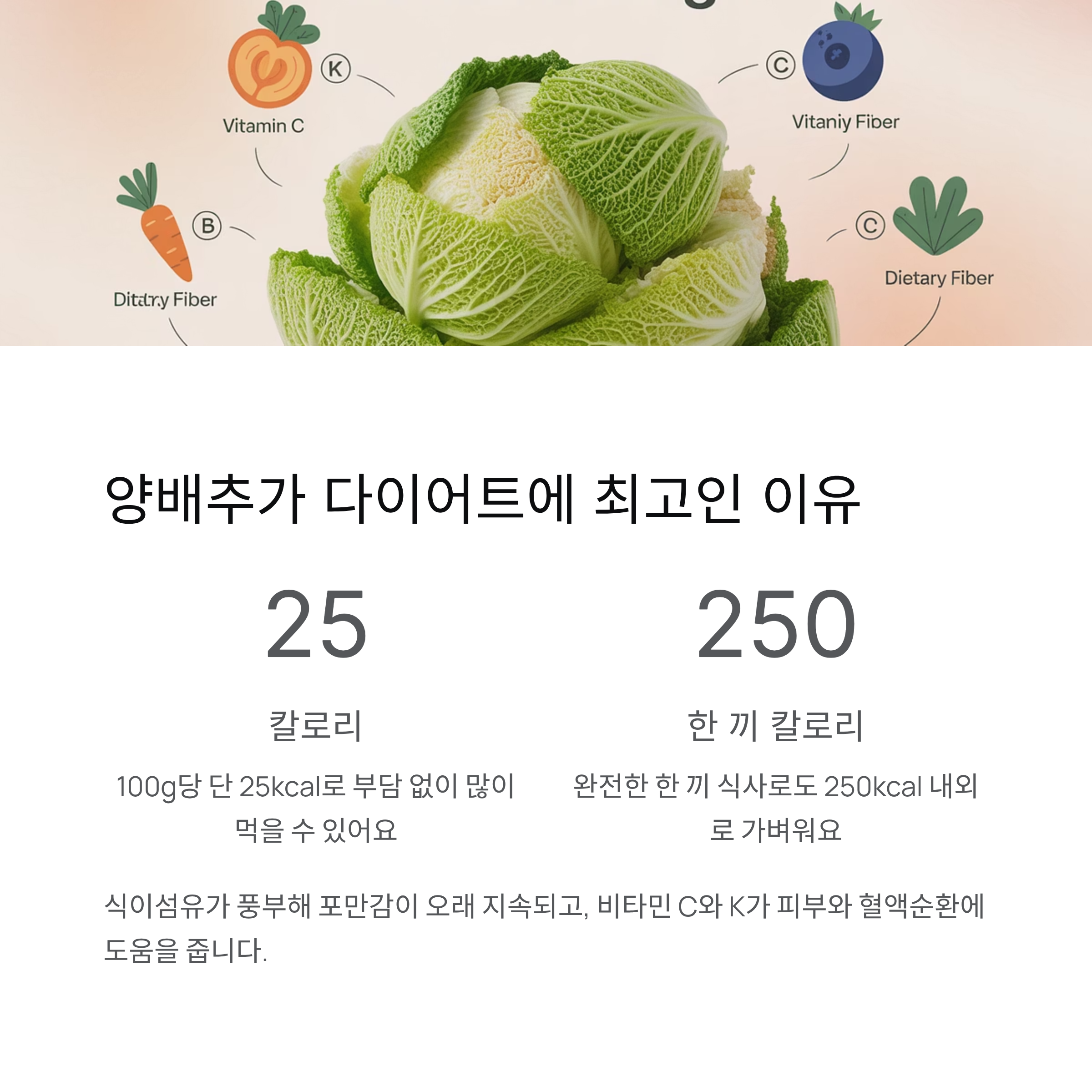 양배추는 칼로리가 낮고 포만감을 오래 유지시켜 주는 식이섬유가 풍부합니다.