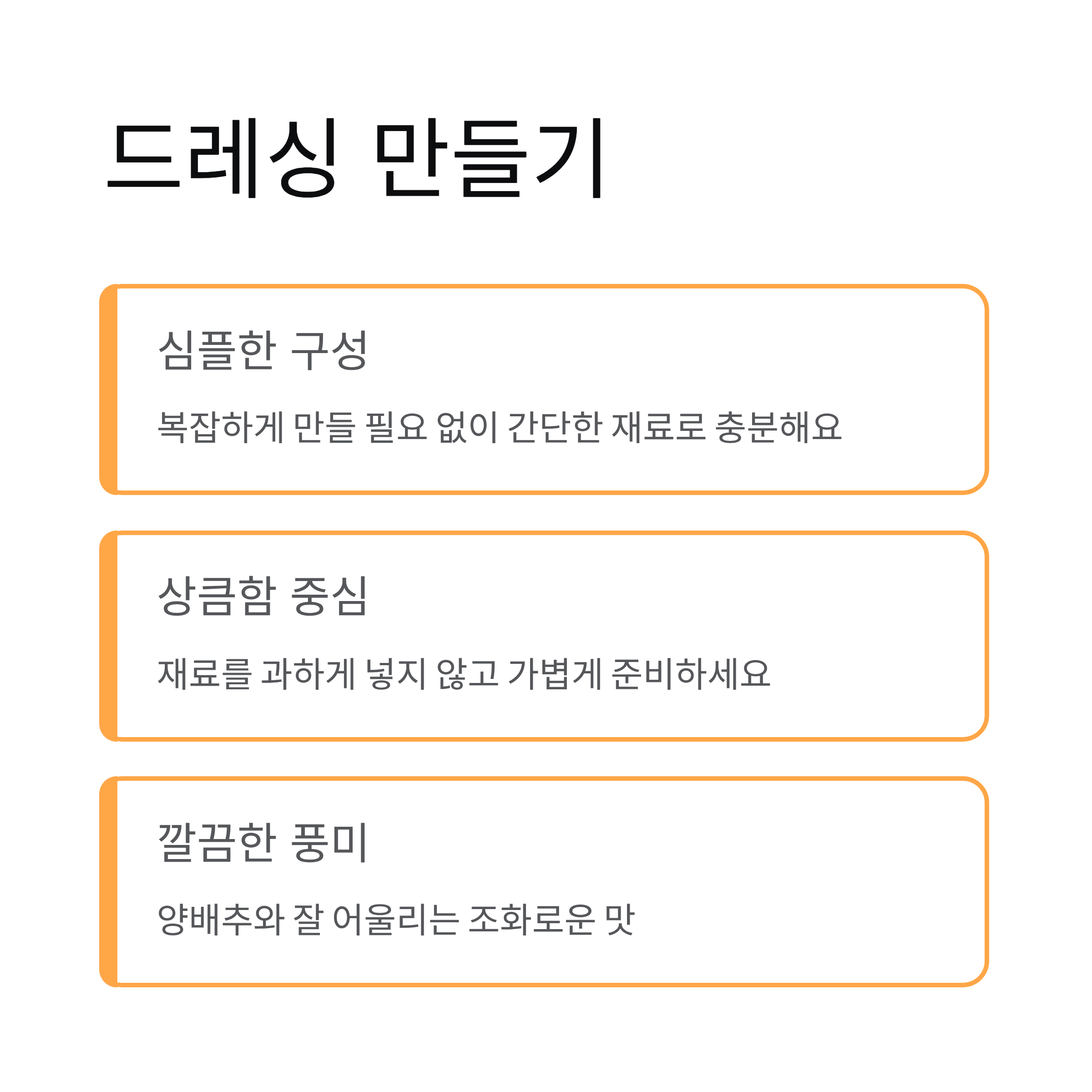 레몬 드레싱은 복잡하게 만들 필요가 없어요. 상큼함을 중심으로 조화를 맞추는 것이 중요하기 때문에 재료를 과하게 넣지 않고 심플하게 준비해도 맛이 잘 살아나요. 양배추와 잘 어울리는 가벼운 구성으로 드레싱을 만들면 전체적인 풍미가 깔끔해져요.