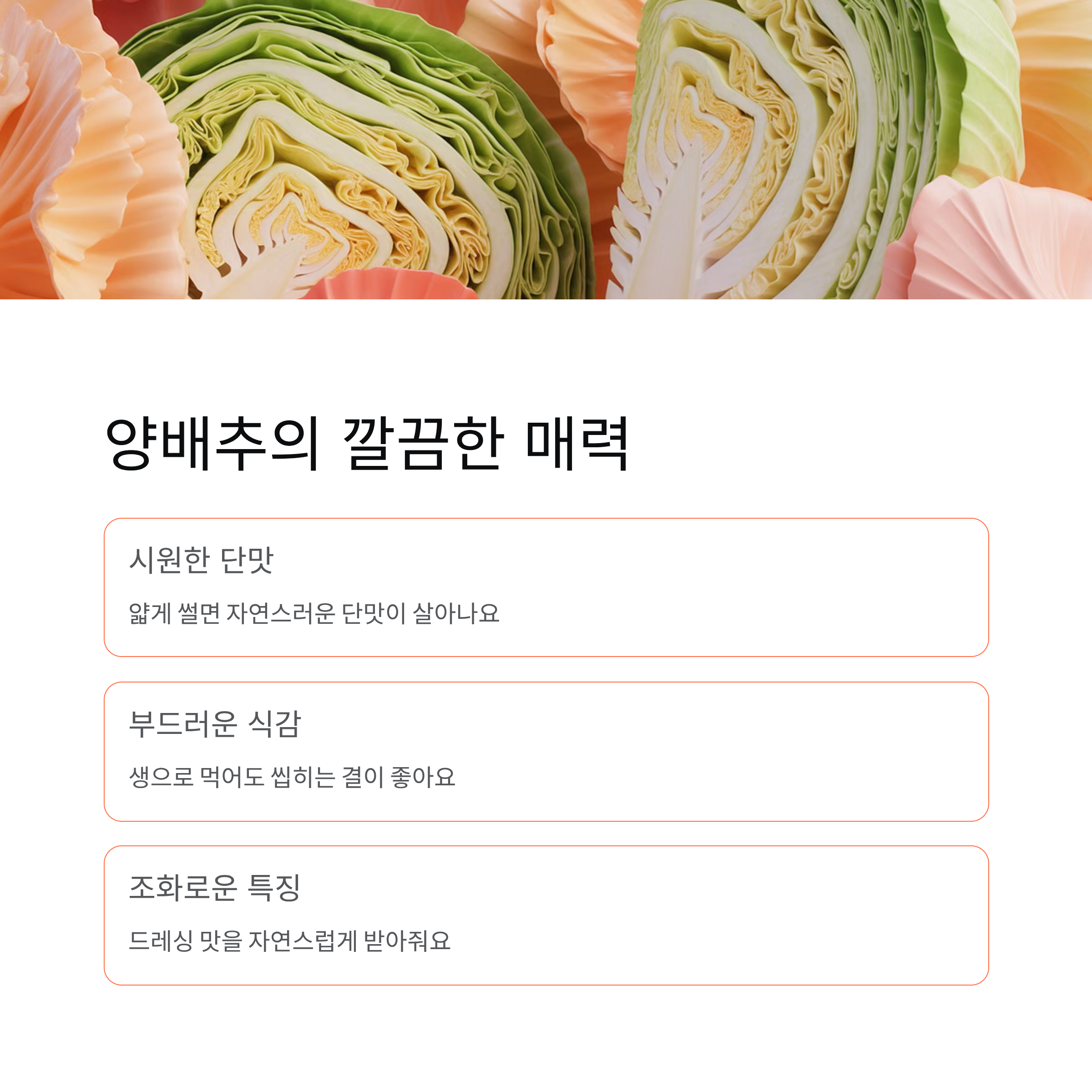 양배추는 얇게 써는 것만으로도 시원한 단맛이 살아나요. 생으로 먹었을 때 부드럽게 씹히는 결이 살아 있어 다른 채소와도 조화가 좋고, 드레싱의 맛을 자연스럽게 받아주는 특징이 있어요. 수분이 적당히 유지되는 채소라 샐러드용으로 활용하기에도 참 좋아요.