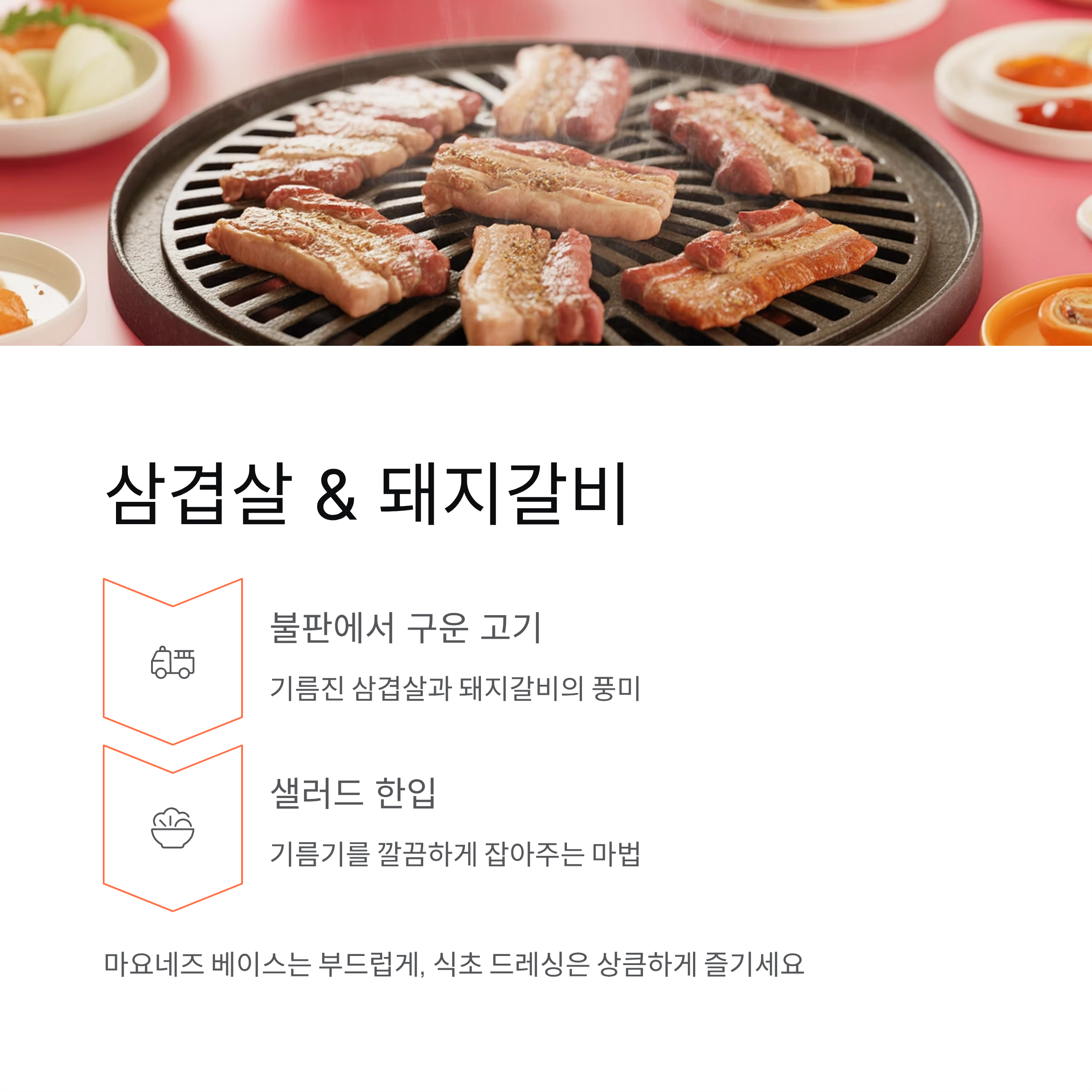 불판 위에서 고기를 구운 뒤, 샐러드 한입과 함께 먹으면 기름기가 부담스럽지 않습니다. 마요네즈 베이스의 샐러드는 고기 맛을 부드럽게 감싸주고, 식초 드레싱을 넣은 버전은 깔끔함을 강조합니다.