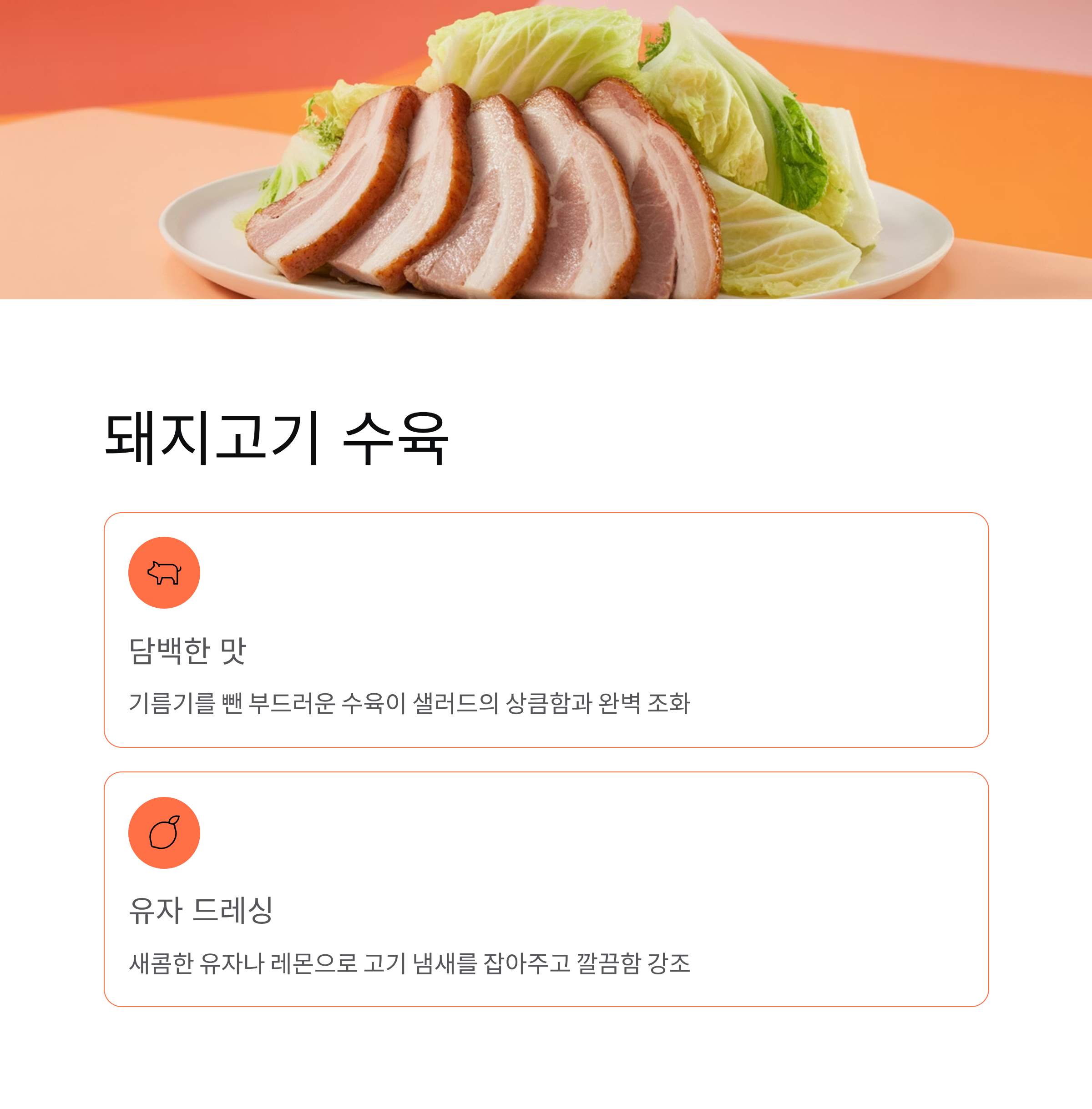 | 돼지고기 수육 | 담백하고 부드러움 | 샐러드의 상큼함과 완벽 조화 |