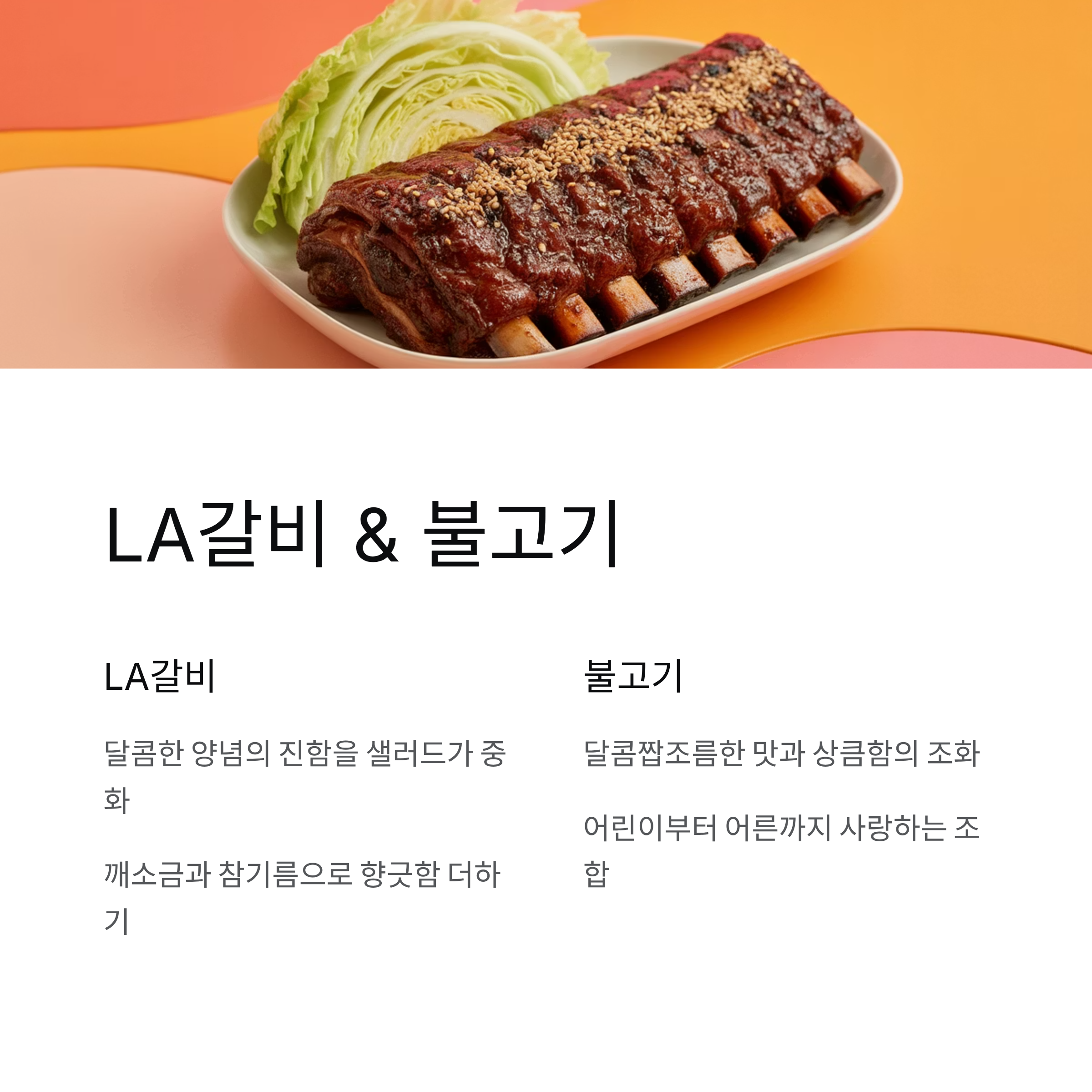 LA갈비처럼 달짝지근한 양념고기는 자칫 무겁게 느껴질 수 있지만, 양배추 샐러드와 함께라면 이야기가 달라집니다. 샐러드의 신선한 맛이 양념의 진함을 중화해 주어 식사 전체가 균형 잡히게 느껴집니다.
