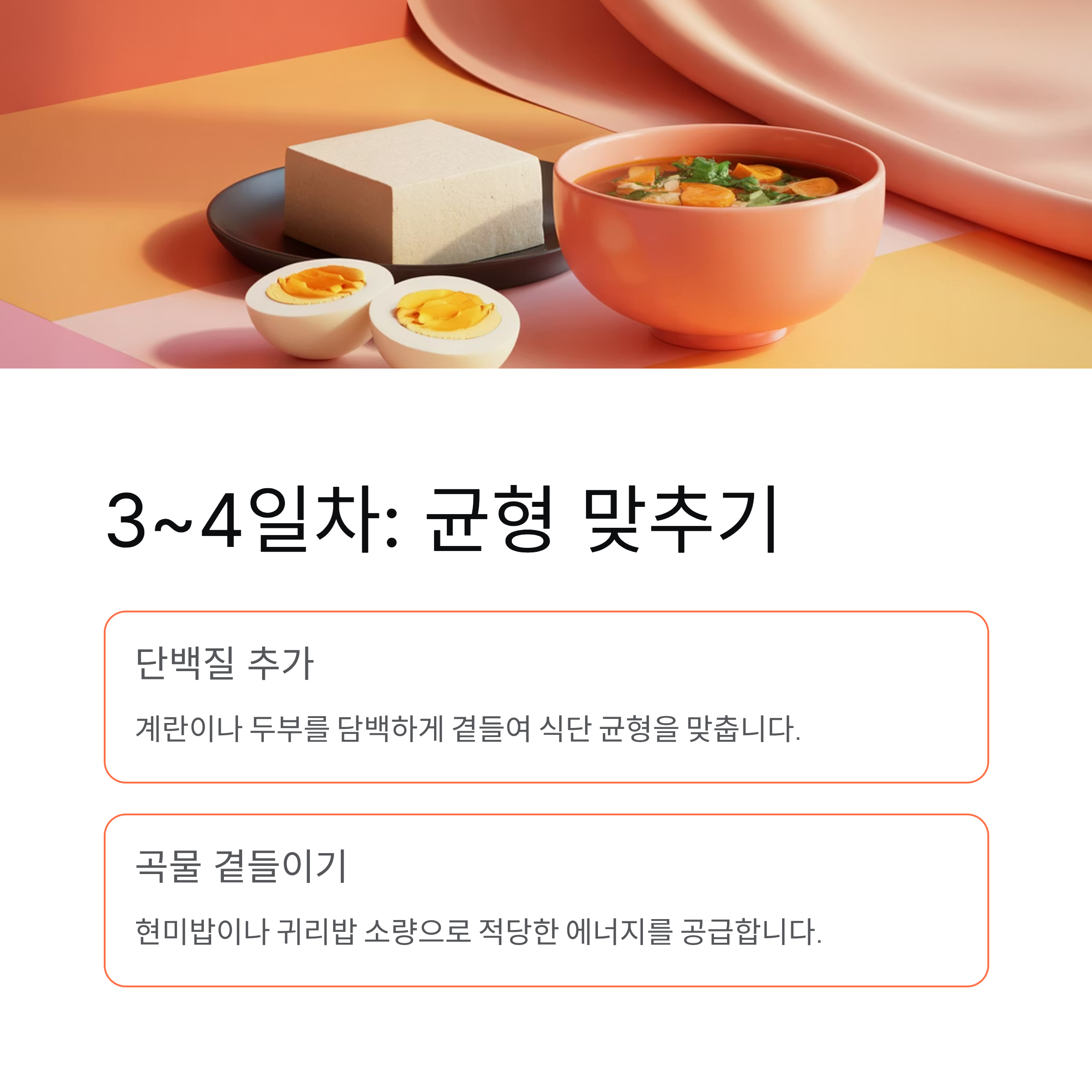 마지막 날에는 양배추 스프에 채소, 단백질, 곡물 등을 균형 있게 구성해 하루를 정리해 보세요. 지나치게 제한하지 않고 균형 중심으로 접근하는 것이 식단 루틴을 편안하게 유지하는 데 도움이 됩니다.