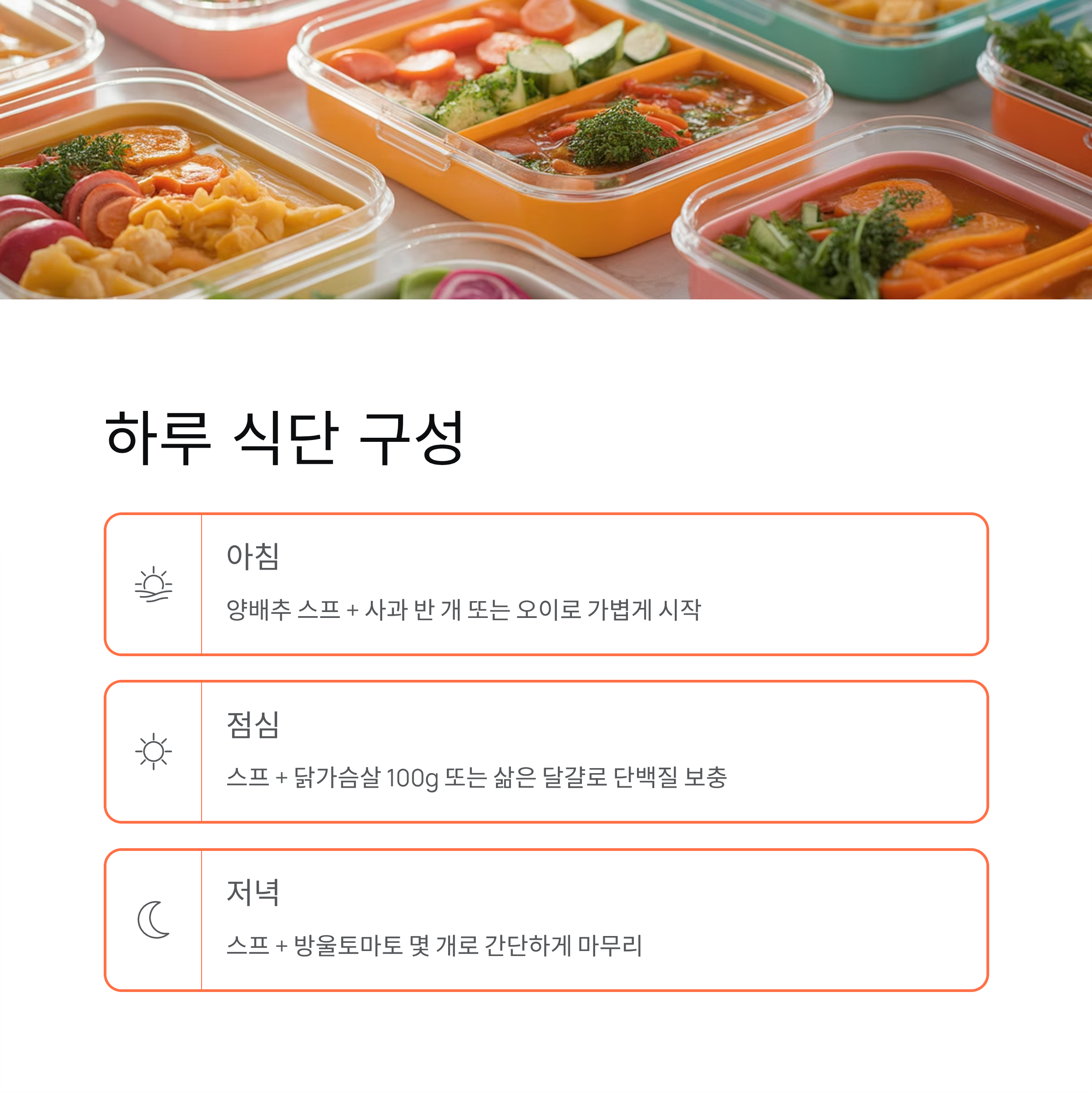 | 아침 | 양배추 스프 + 사과 반 개 | 가볍게 시작 |
