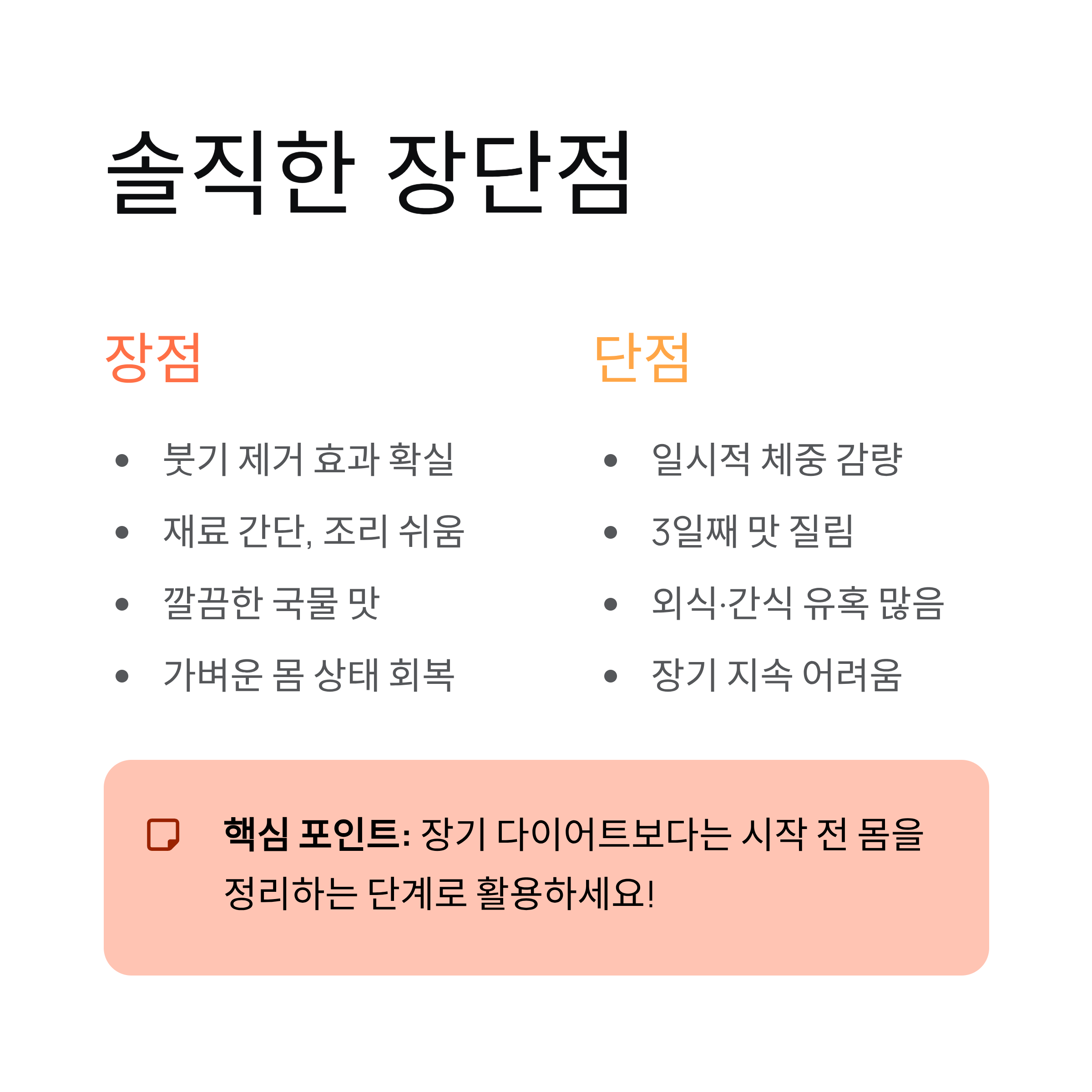 | 효과 | 붓기 제거, 가벼운 몸 상태 | 일시적 체중감량 |