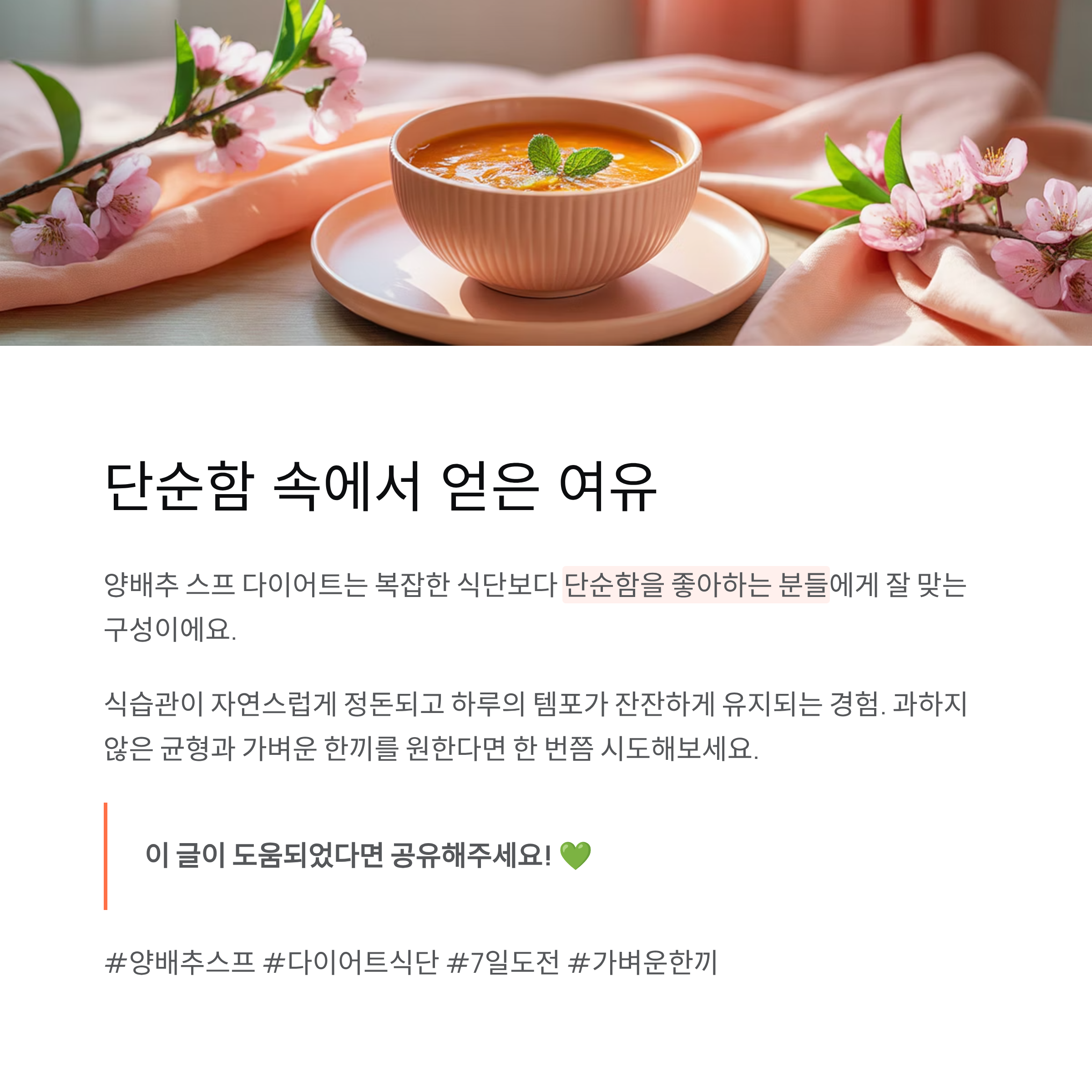 양배추 스프 다이어트는 복잡한 식단보다 단순함을 좋아하는 분들에게 잘 맞는 구성이에요. 조리도 쉽고 부담 없으며, 루틴을 잡기 좋은 식단이에요. 일주일간 진행해보니 식습관이 자연스럽게 정돈되고 하루의 템포가 잔잔하게 유지되더라고요. 과하지 않은 균형과 가벼운한끼 구성을 원하는 분이라면 한 번쯤 경험해볼 만한 식단이었습니다.