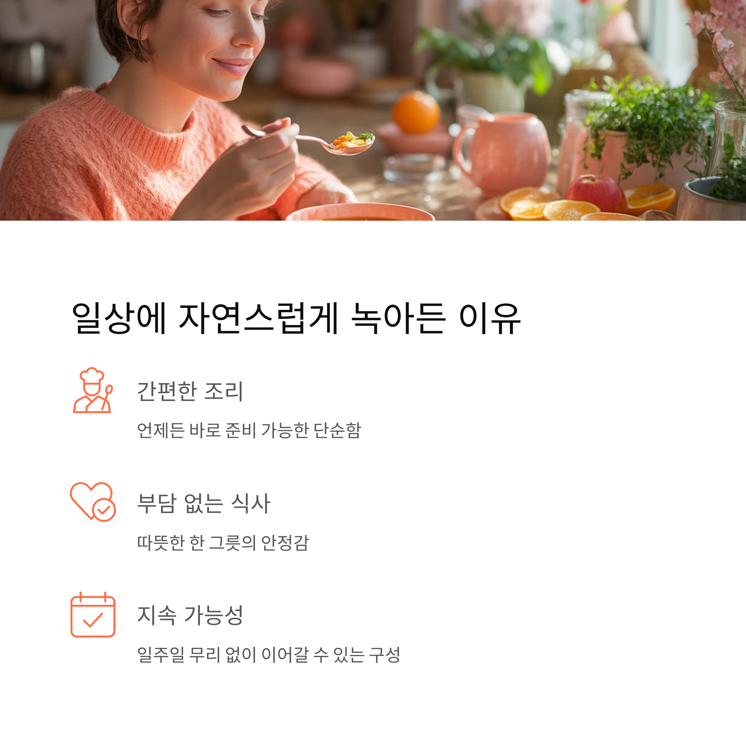 조리 과정이 간단해 언제든 바로 준비할 수 있고, 부담 없이 먹기 좋아 식사 대용으로 편안했어요. 따뜻한 한 그릇이 주는 안정감 덕분에 식단관리 관점에서도 일주일 동안 무리 없이 이어갈 수 있었습니다.