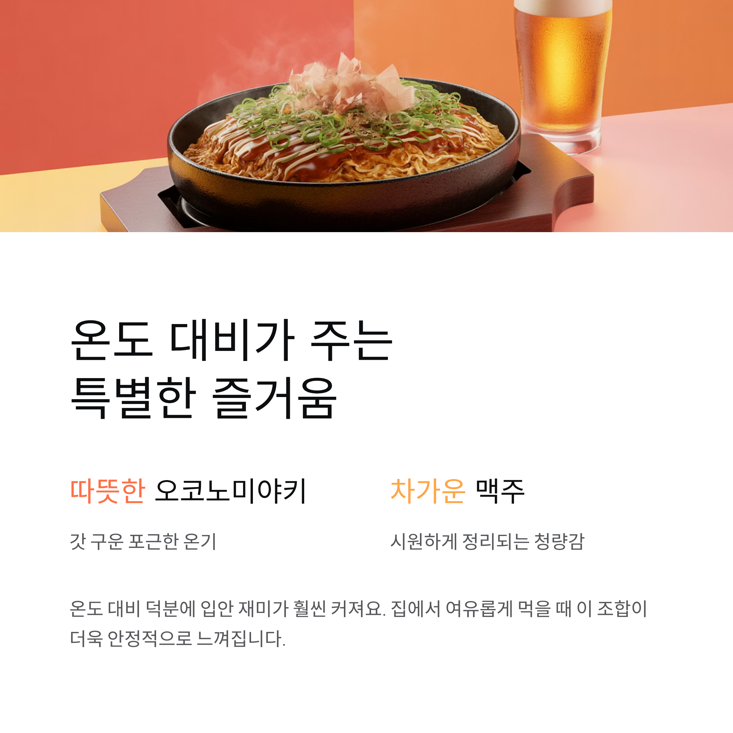 갓 구운 따뜻한 오코노미야키에 차가운 맥주를 곁들이면 온도 대비 덕분에 입안 재미가 훨씬 커져요. 특히 집에서 여유롭게 먹을 때 이 조합이 더욱 안정적으로 느껴졌습니다.