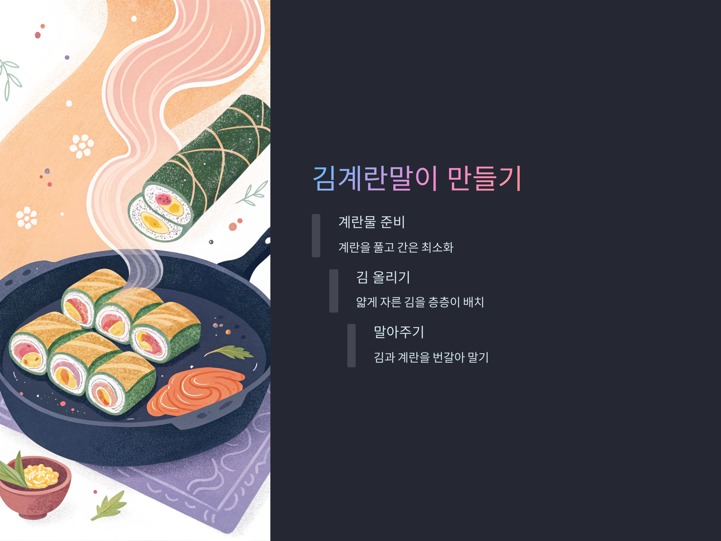 기본 계란물에 얇게 자른 김을 층층이 올리며 말기만 하면 되며, 간을 따로 하지 않아도 맛이 풍부해 짜지 않게 조절할 수 있습니다.
