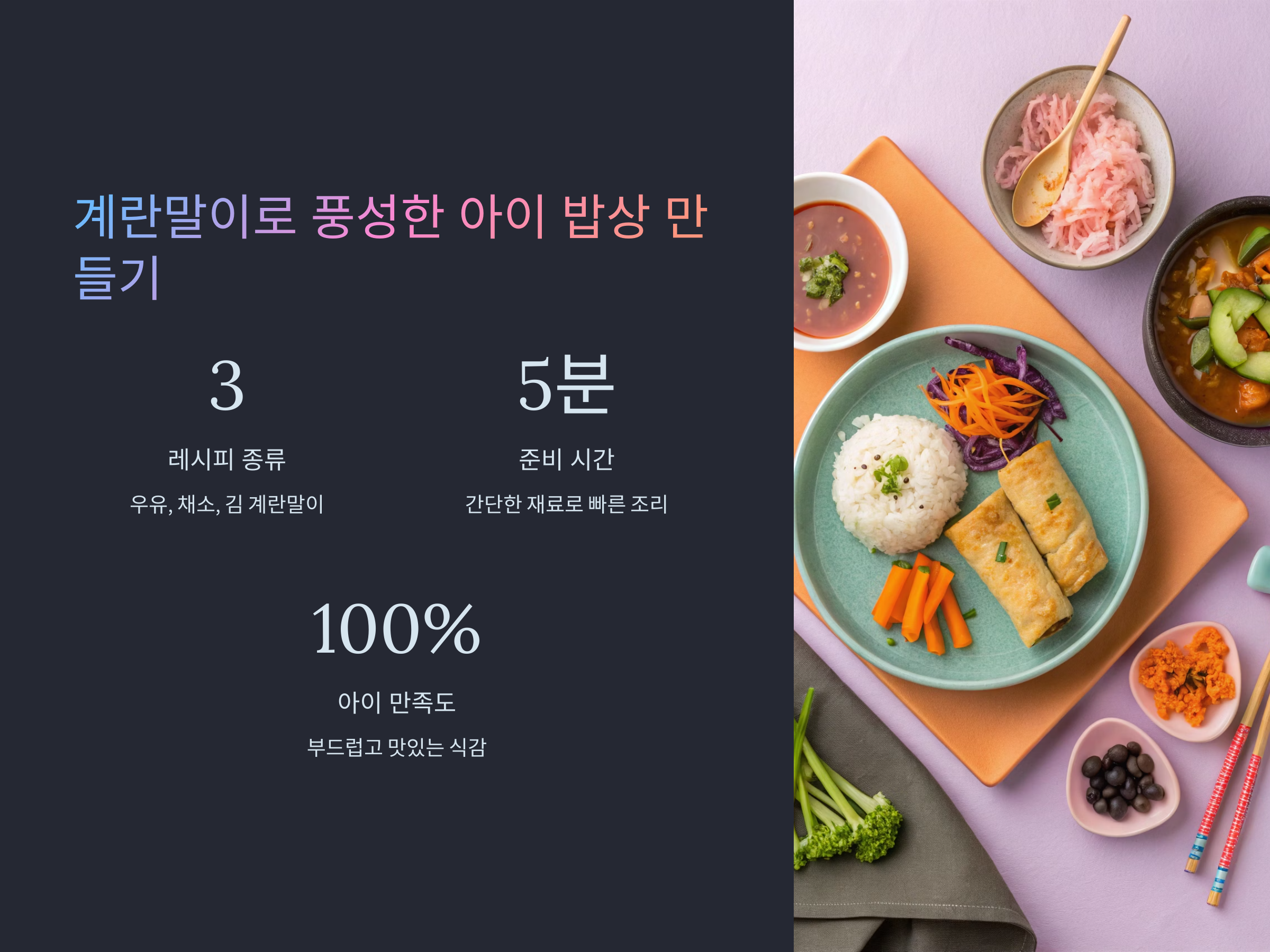 | 밝은 색감 | 채소, 김 등 시각적 흥미 유도 |