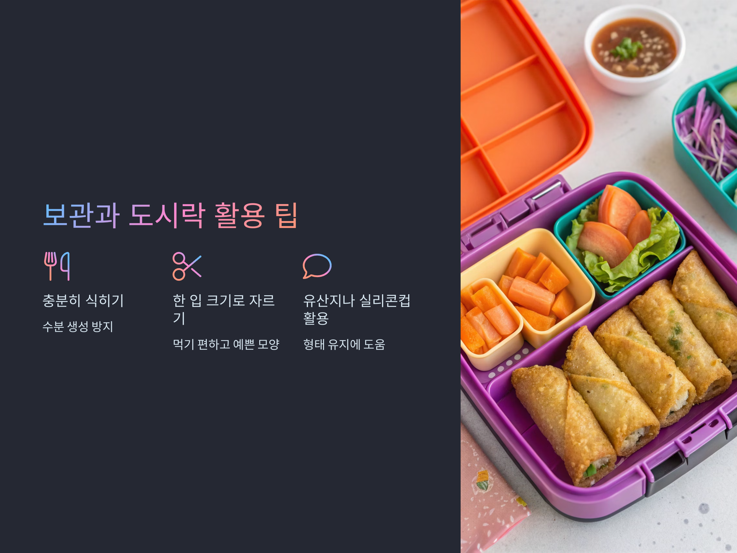 - 충분히 식힌 뒤 도시락에 담아야 수분이 생기지 않습니다.