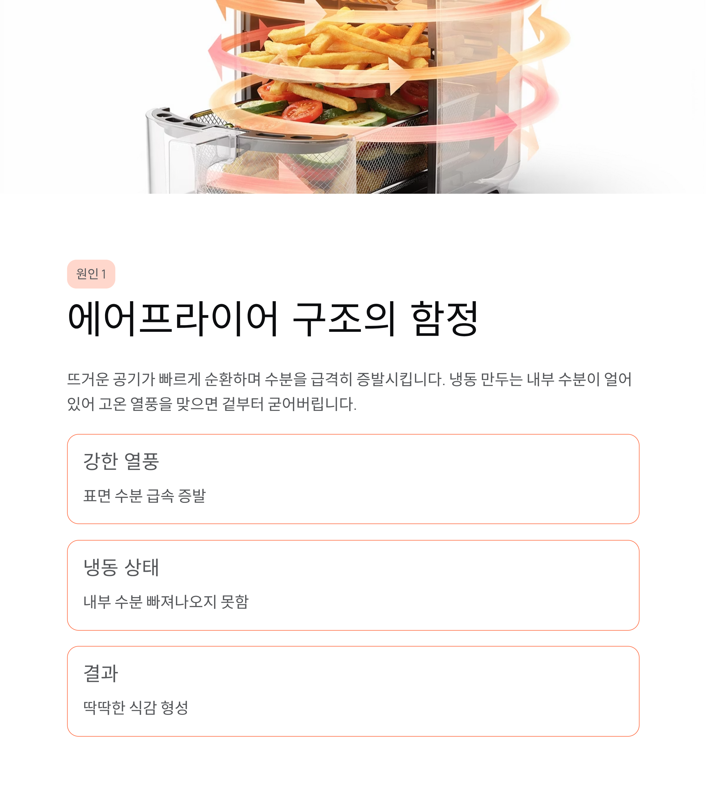 에어프라이어는 뜨거운 공기를 빠르게 순환시키며 수분을 증발시키는 구조입니다. 이 방식은 튀김이나 구이에 강점이 있지만, 수분을 머금고 있어야 맛있는 군만두에는 불리하게 작용합니다. 특히 냉동 만두는 내부 수분이 얼어 있는 상태라 고온의 공기를 바로 맞으면 겉의 수분부터 급격히 날아갑니다. 이로 인해 표면은 빠르게 굳고 내부 수분이 빠져나오지 못해 전체적으로 딱딱한 식감이 만들어집니다. 즉, 에어프라이어의 장점인 강한 열풍이 군만두에는 단점으로 작용하는 구조입니다.