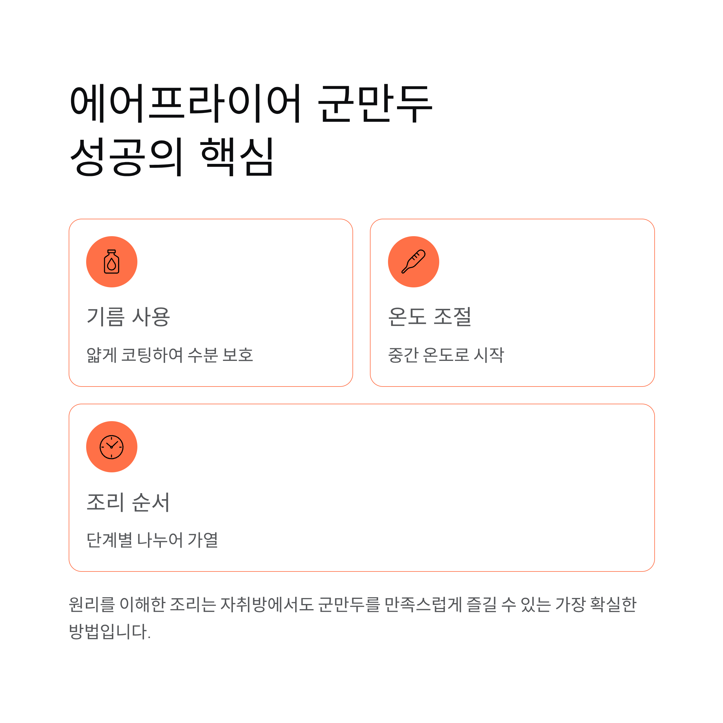 아래는 에어프라이어 군만두를 부드럽게 완성하기 위한 핵심 흐름입니다.