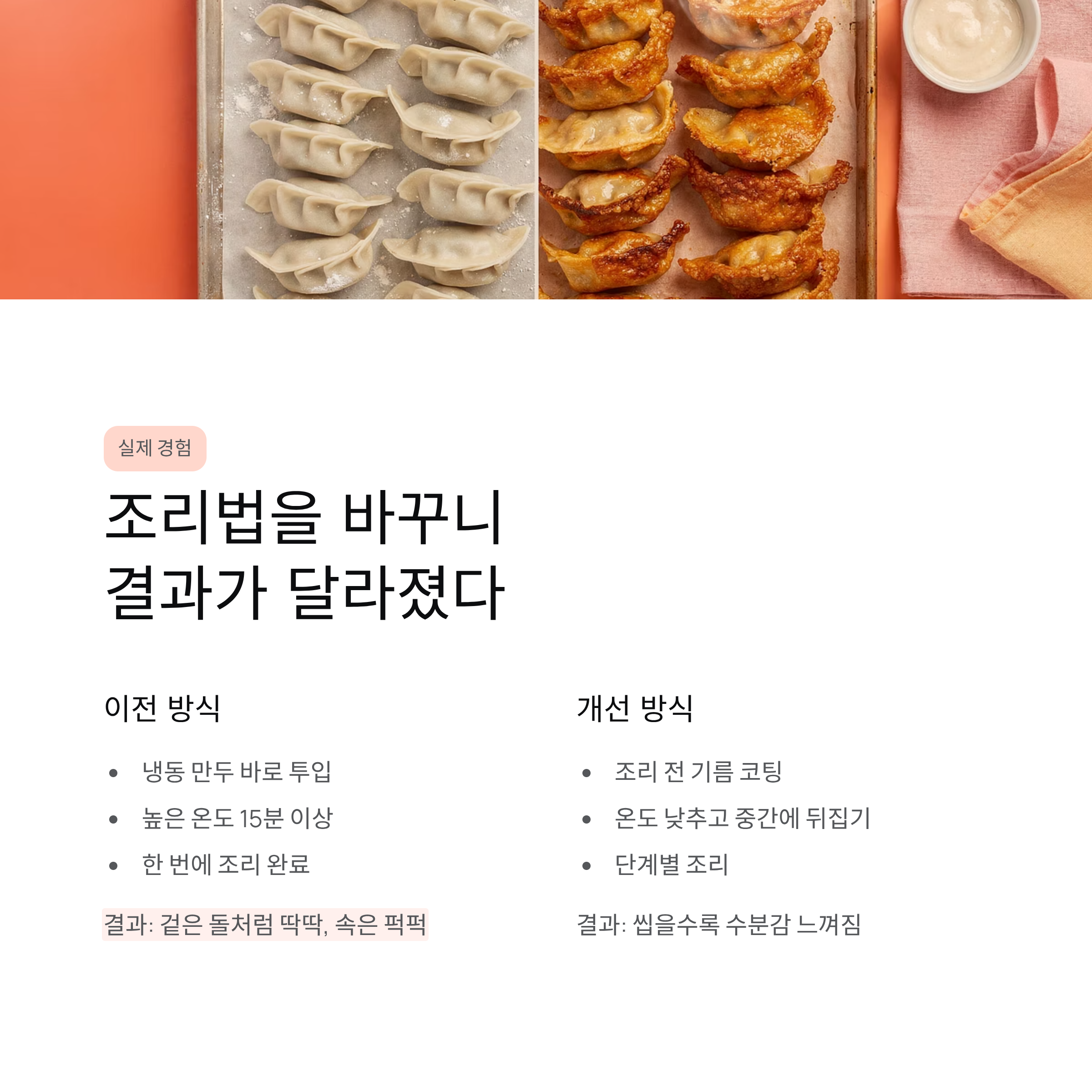 처음 에어프라이어를 사용할 때는 냉동 만두를 바로 높은 온도에 넣고 15분 이상 조리했습니다. 결과는 항상 비슷했습니다. 겉은 돌처럼 딱딱했고 속은 퍽퍽했습니다. 이후 조리 전 기름을 살짝 바르고, 온도를 낮춘 뒤 중간에 한 번 꺼내 뒤집는 방식으로 바꿨습니다. 같은 만두였지만 식감은 확연히 달라졌고, 딱딱함 대신 씹을수록 수분감이 느껴졌습니다. 이 변화는 만두의 문제가 아니라 열과 수분 관리의 문제였다는 점을 분명히 보여줍니다.