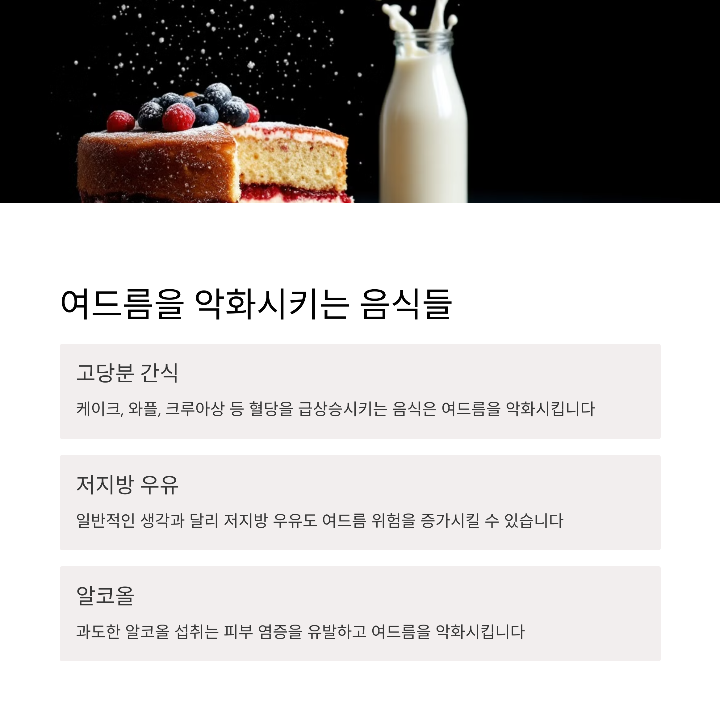 | 여드름 유발 요인 | 기름진 음식, 수면 부족, 스트레스 등이 주요 원인입니다. |
