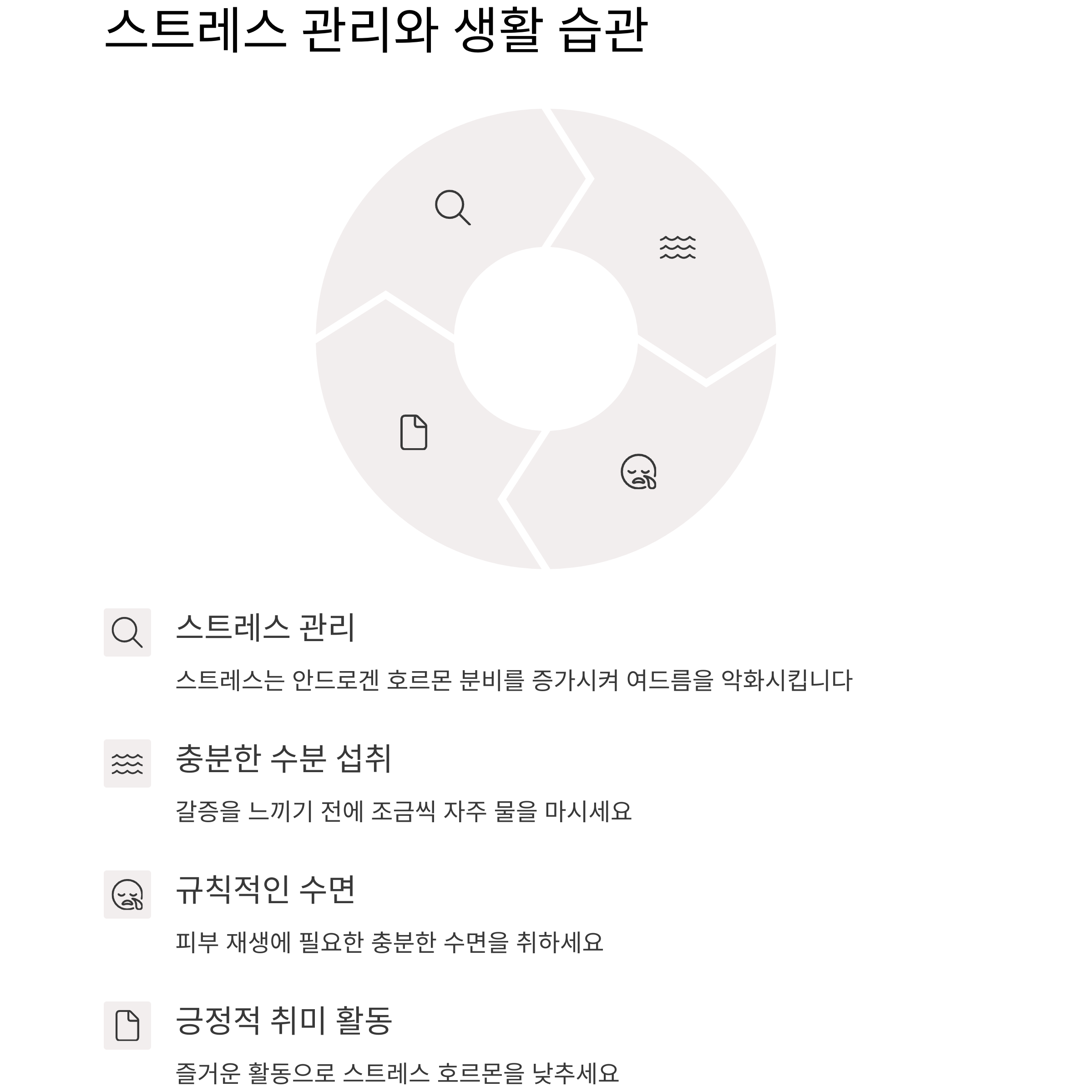 | 식습관 조절 | 세안 습관 | 수면과 스트레스 |