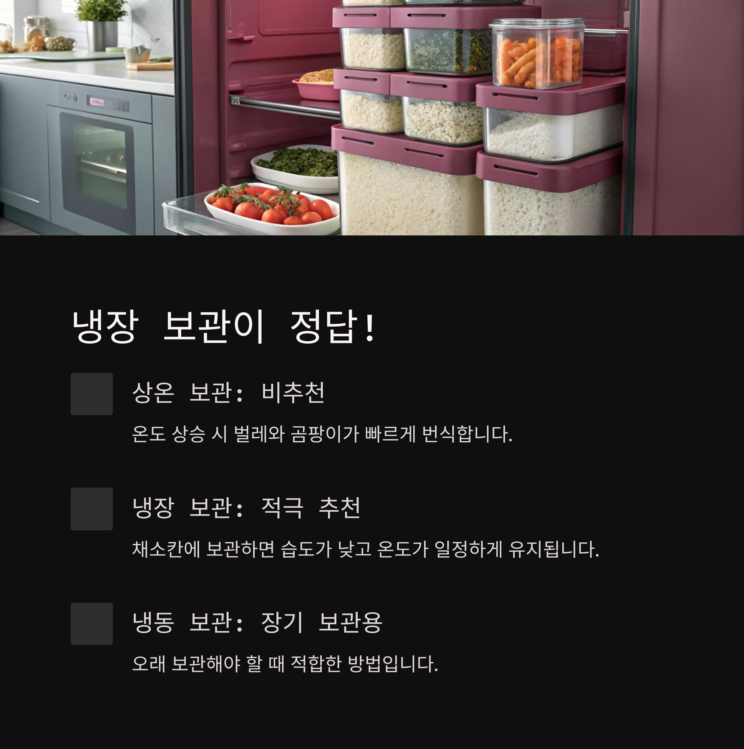 | 상온 | 비추천 | 온도 상승 시 벌레·곰팡이 발생 |