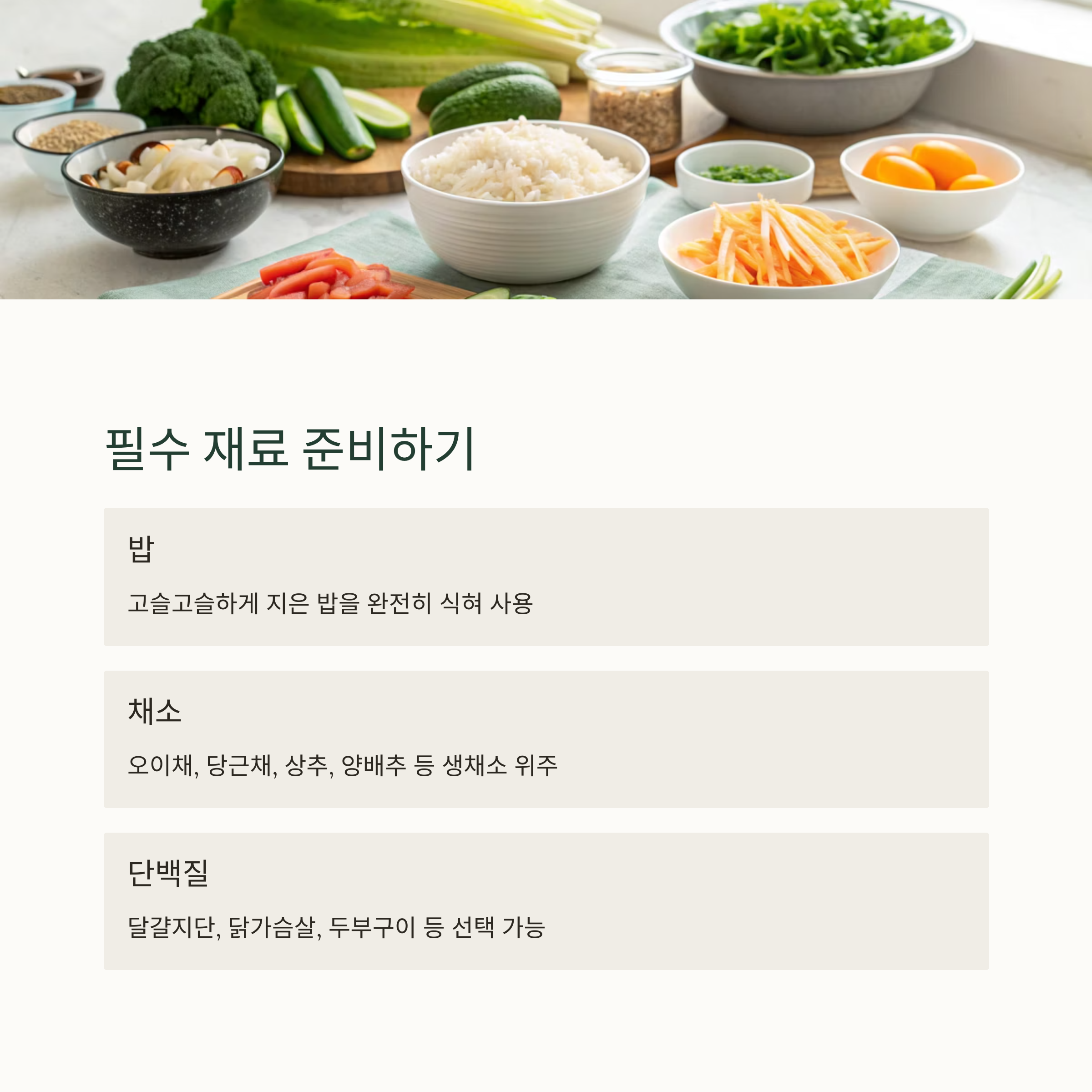 | 단백질 | 달걀지단, 닭가슴살 찢은 것, 두부구이 등 선택 가능 |
