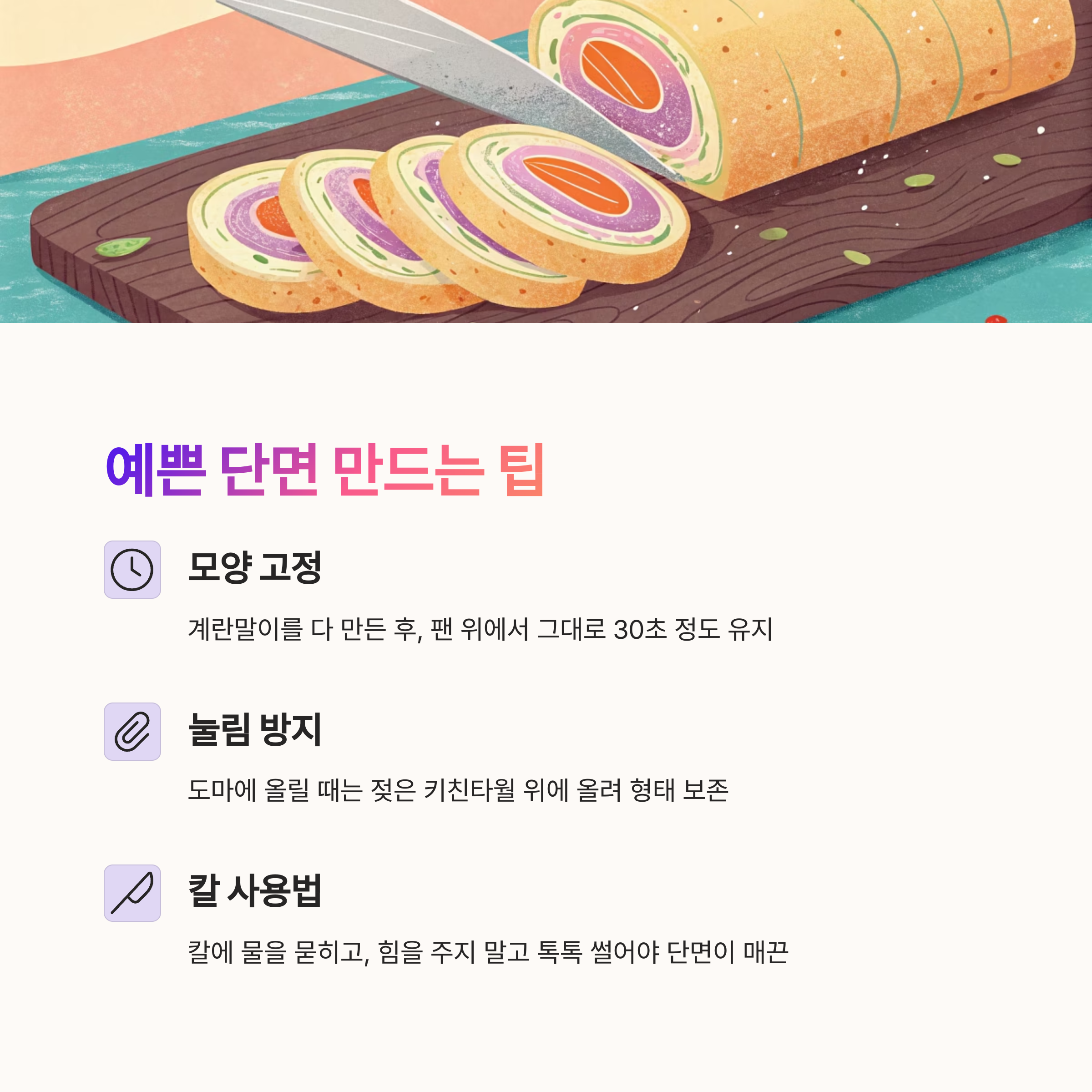 - 칼에 물을 묻히고, 힘을 주지 말고 톡톡 썰어야 단면이 매끈
