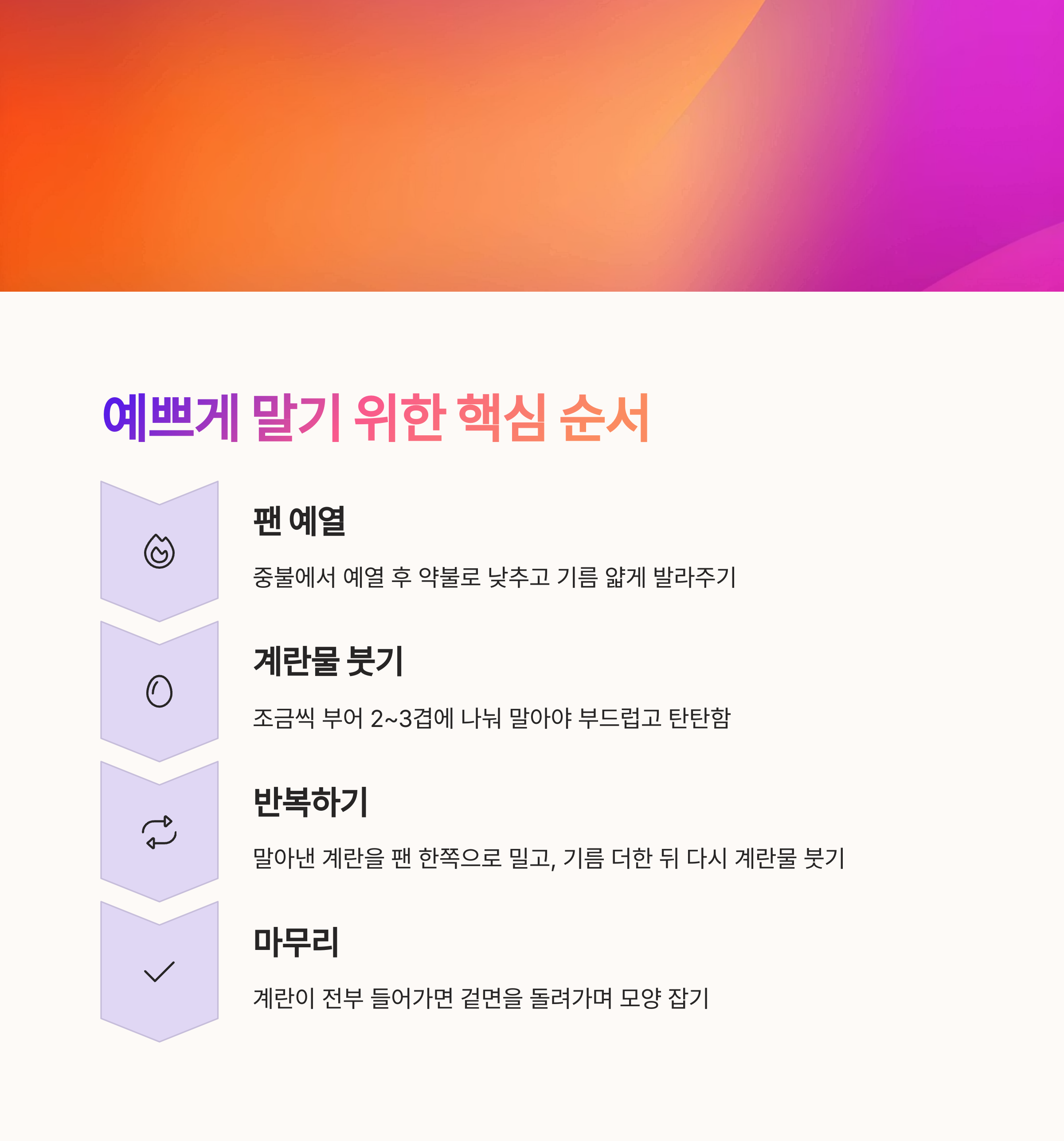 | 찢어짐 | 팬 온도 과열, 계란물 너무 두꺼움 | 약불 유지, 얇게 여러 번 붓기 |