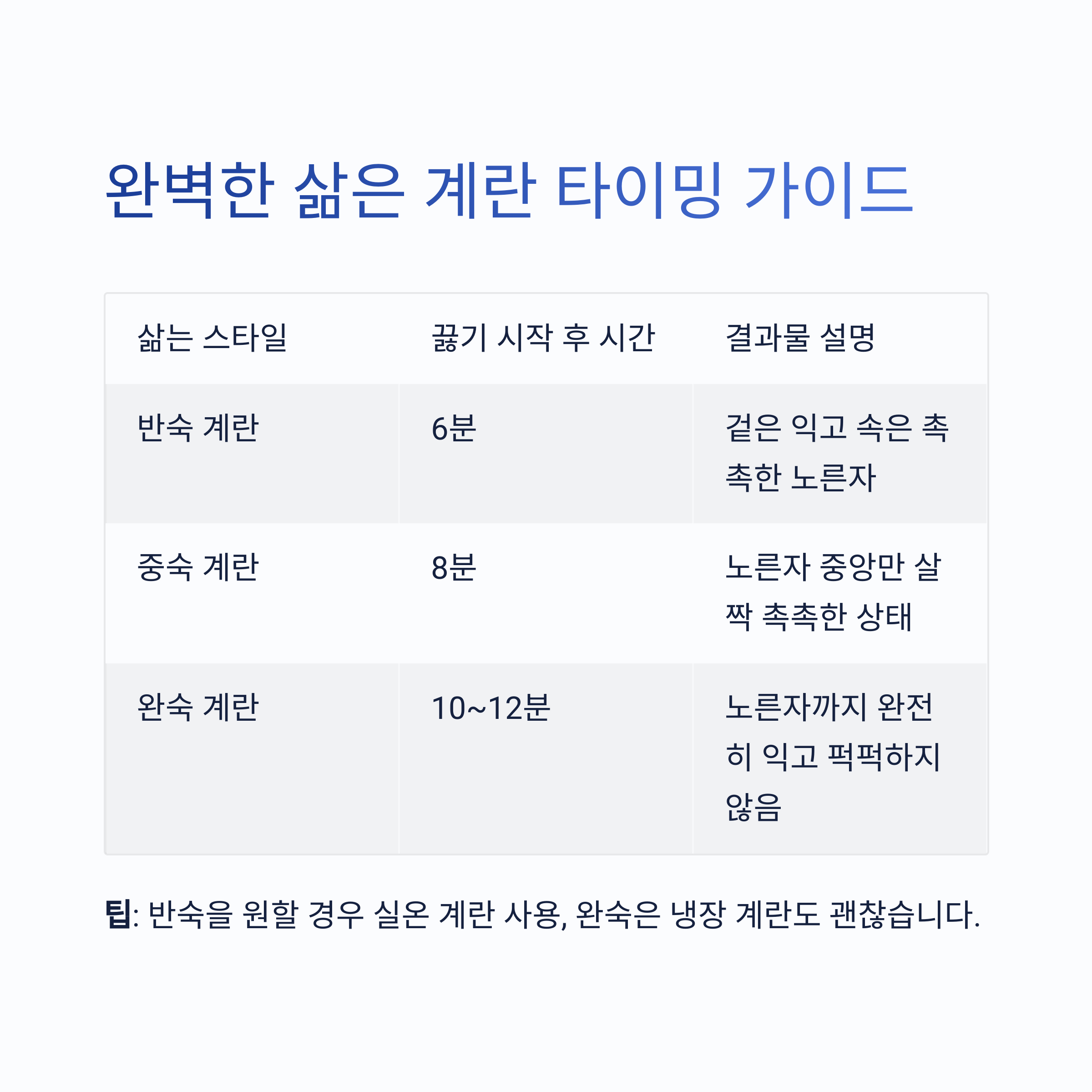 | 반숙 계란 | 6분 | 겉은 익고 속은 촉촉한 노른자 |