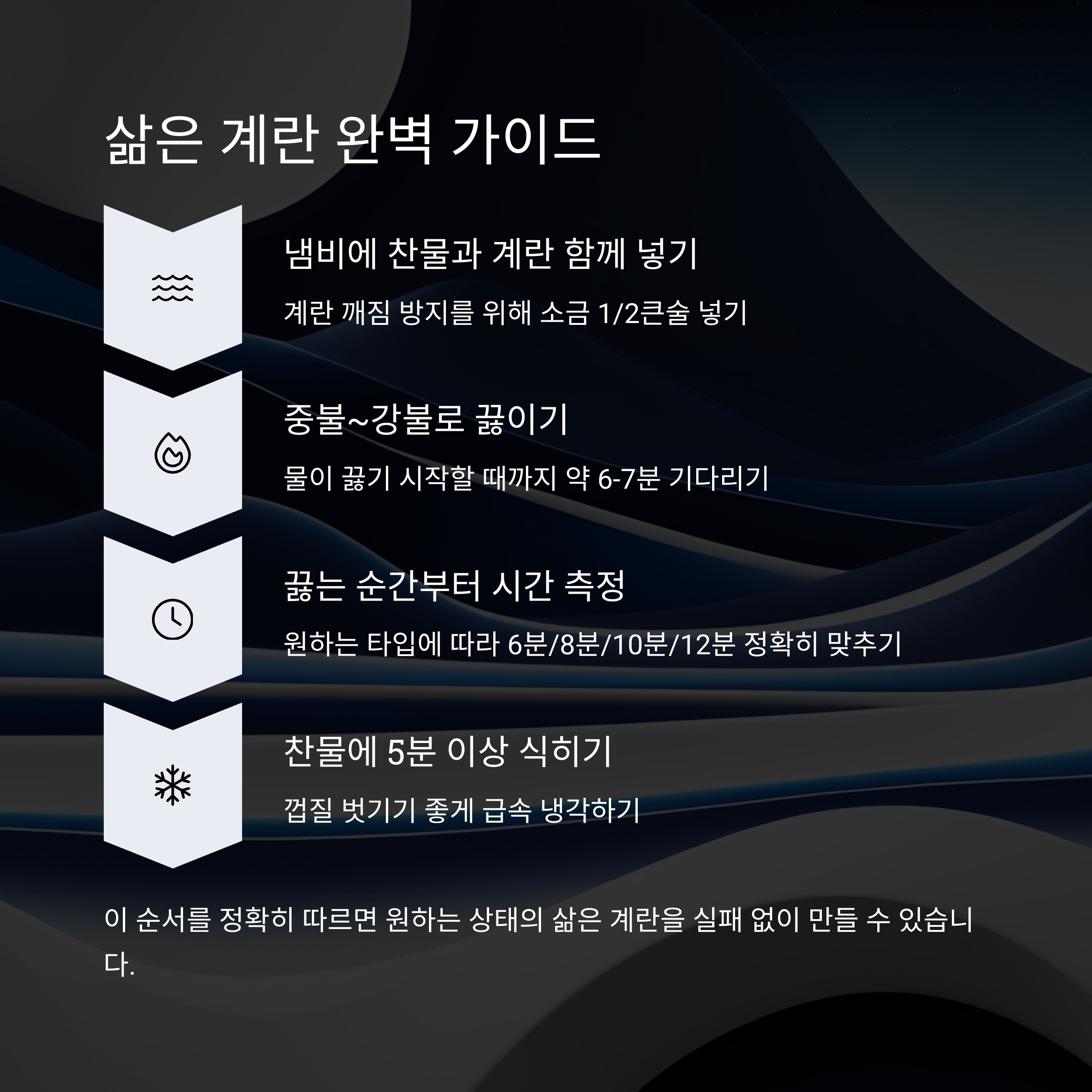 원하는 타입에 따라 6분/8분/10분/12분 정확히 맞추세요. - 타이머가 끝나면 즉시 찬물에 5분 이상 식혀