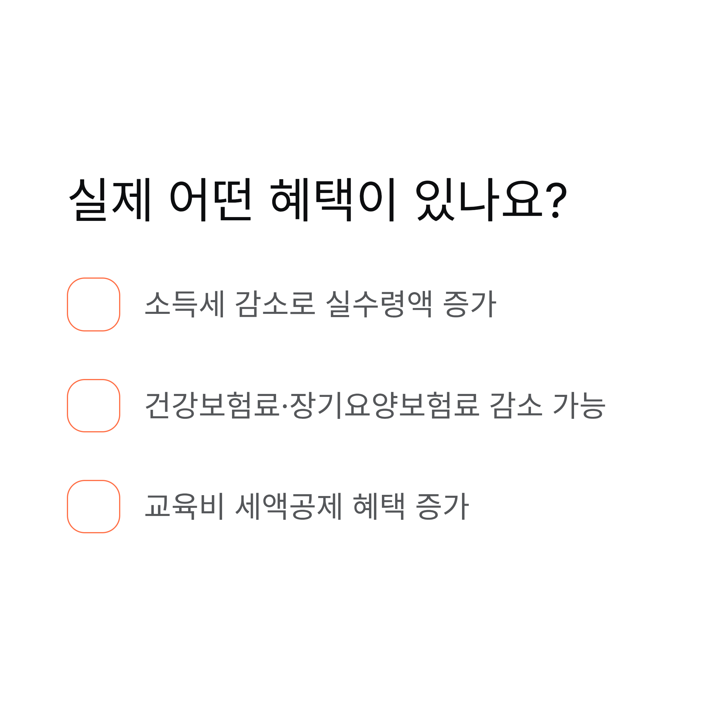 - 월 급여 180만 원 → 150만 원은 비과세, 나머지 30만 원만 과세