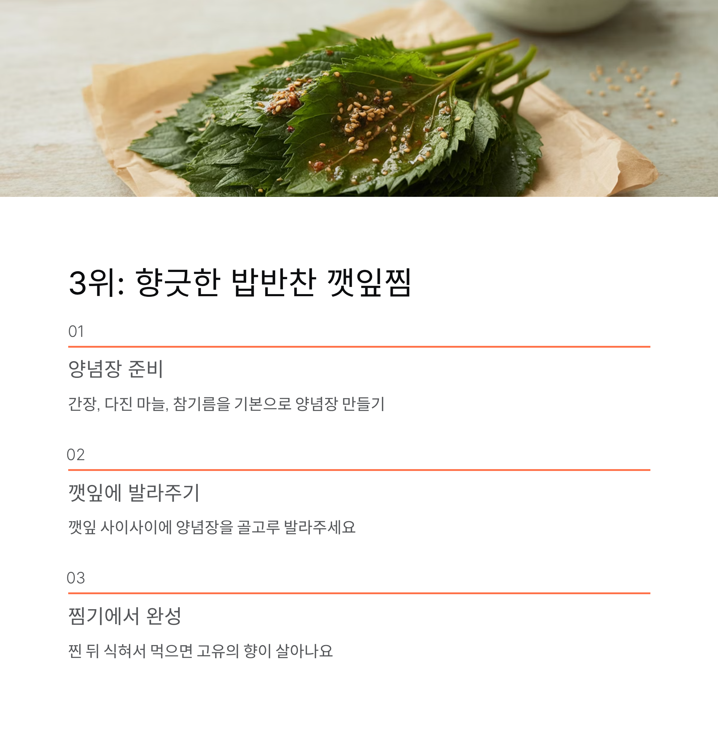 간장·다진 마늘·참기름을 기본으로 한 양념장을 깻잎 사이사이에 발라 찐 뒤, 식혀서 먹으면 고유의 향이 살아나면서도 부담 없이 즐길 수 있습니다.