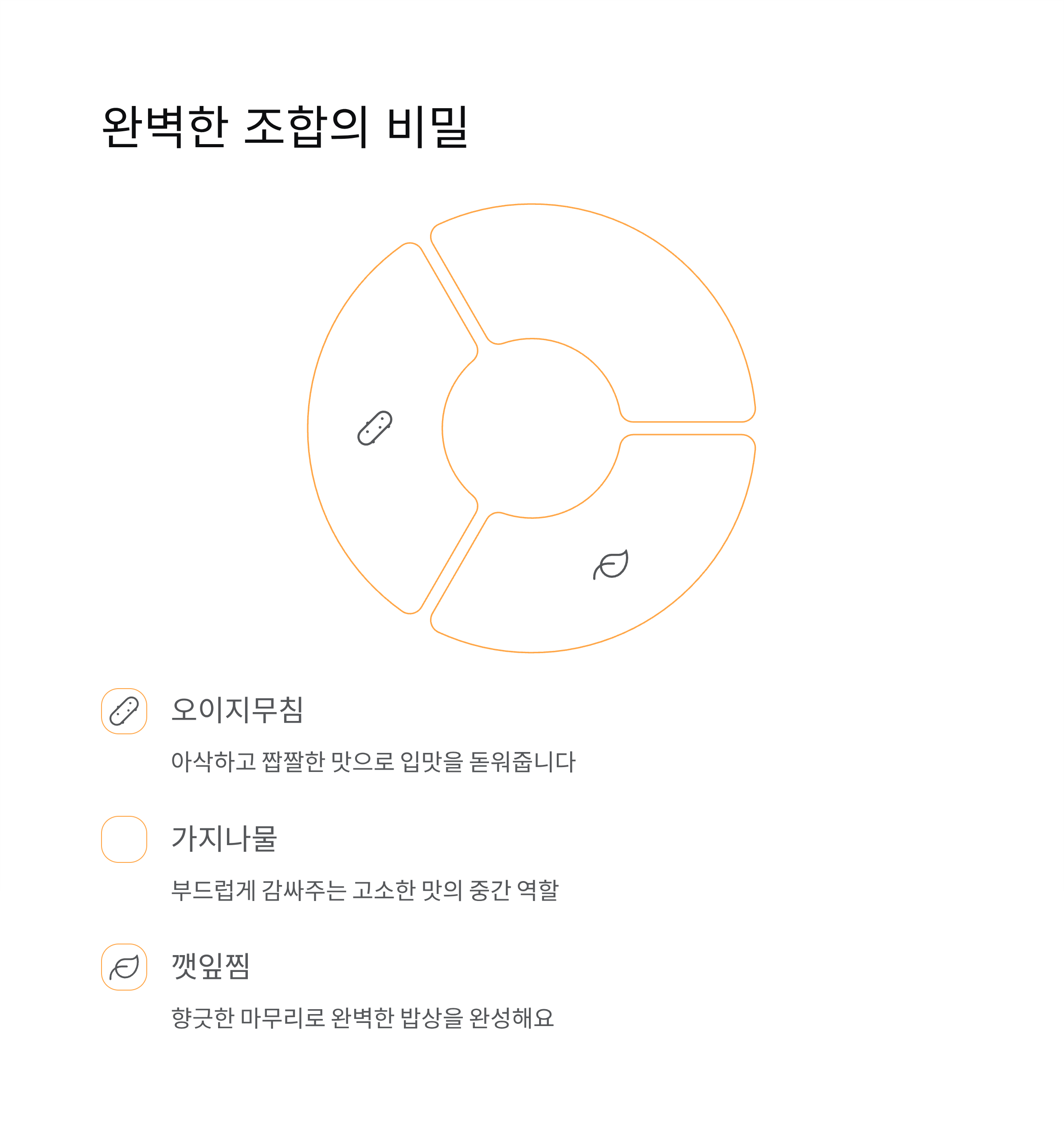 오이지무침은 아삭하고 짭짤한 맛으로 입맛을 돋우고, 가지나물은 부드럽게 감싸주며, 깻잎찜은 향긋한 마무리를 담당합니다.
