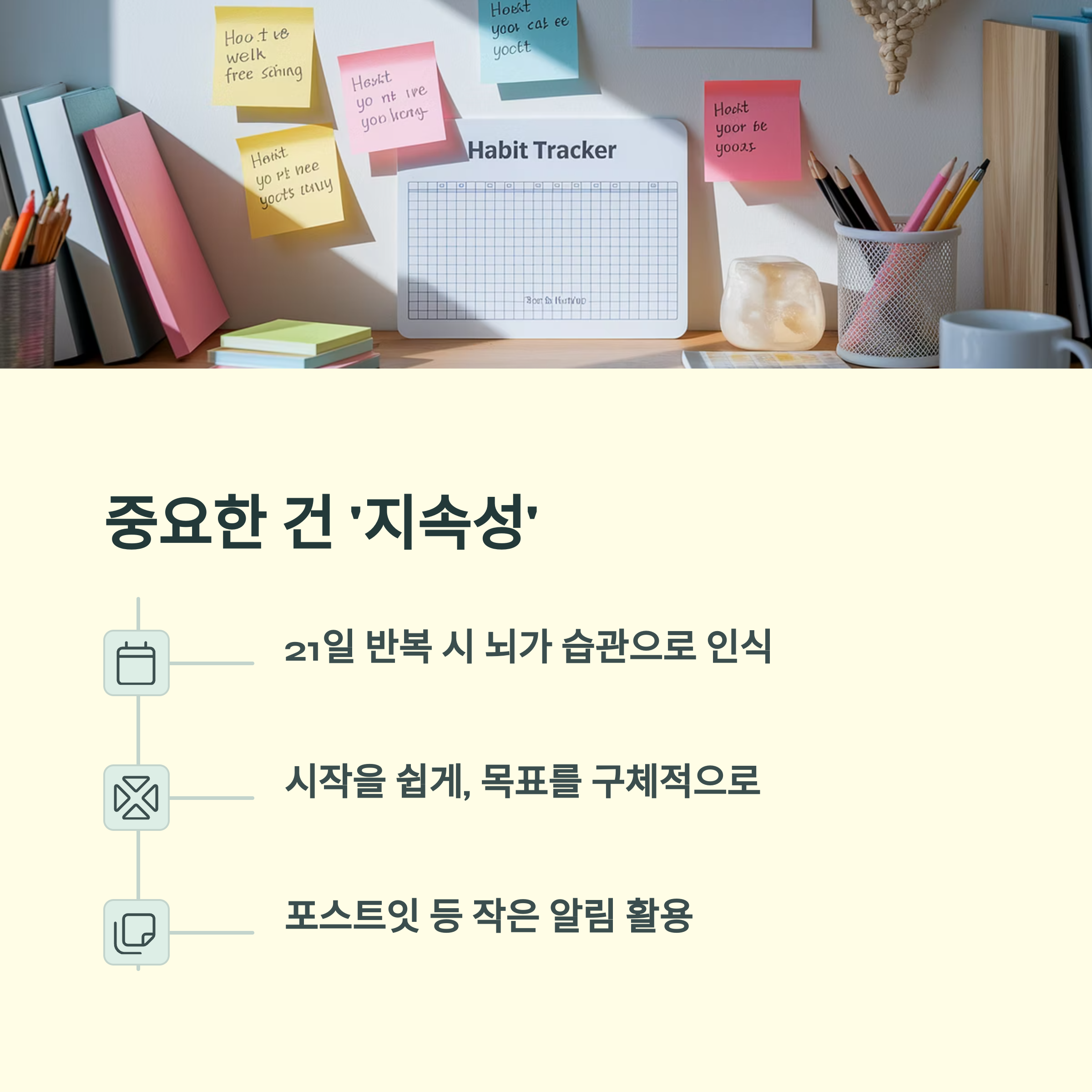 건강 습관을 잘 유지하려면 ‘의식적인 반복’이 필요합니다. 처음에는 사소해 보이는 행동도 의식적으로 실천하고 기록하면 어느새 루틴으로 자리 잡을 수 있어요. 예를 들어 하루 3번 깊게 숨 쉬기, 틈날 때마다 스트레칭하기, 눈 깜빡이며 눈의 피로 줄이기 등 짧은 시간 안에 가능한 활동들이 내 몸을 위한 최고의 투자임을 알게 될 거예요.