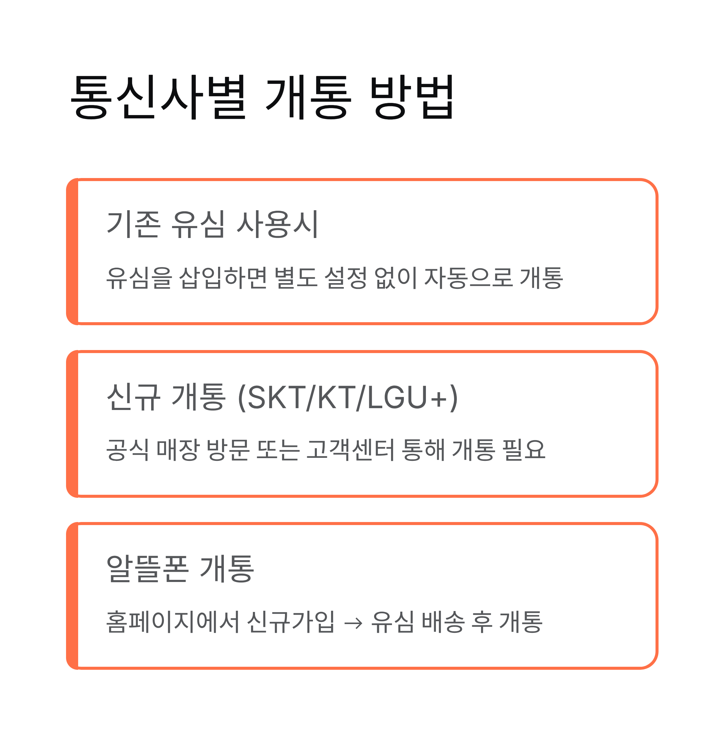 | SKT / KT / LGU+ | 유심 장착 후 자동 사용 가능 | 공식 매장 방문 또는 고객센터 통해 개통 필요 |
