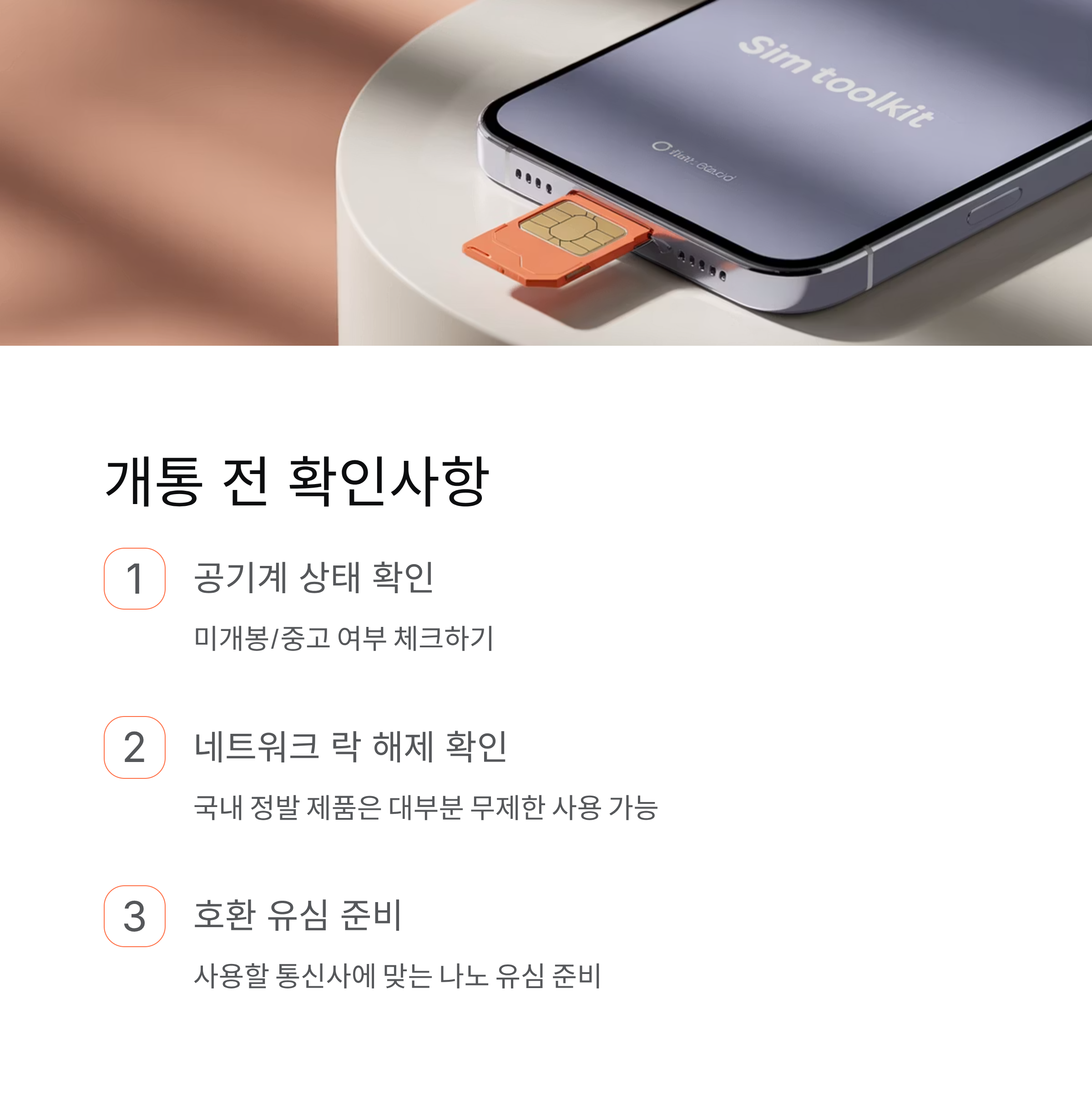 - 호환 유심 확인: 사용할 통신사 요금제에 맞는 유심 준비