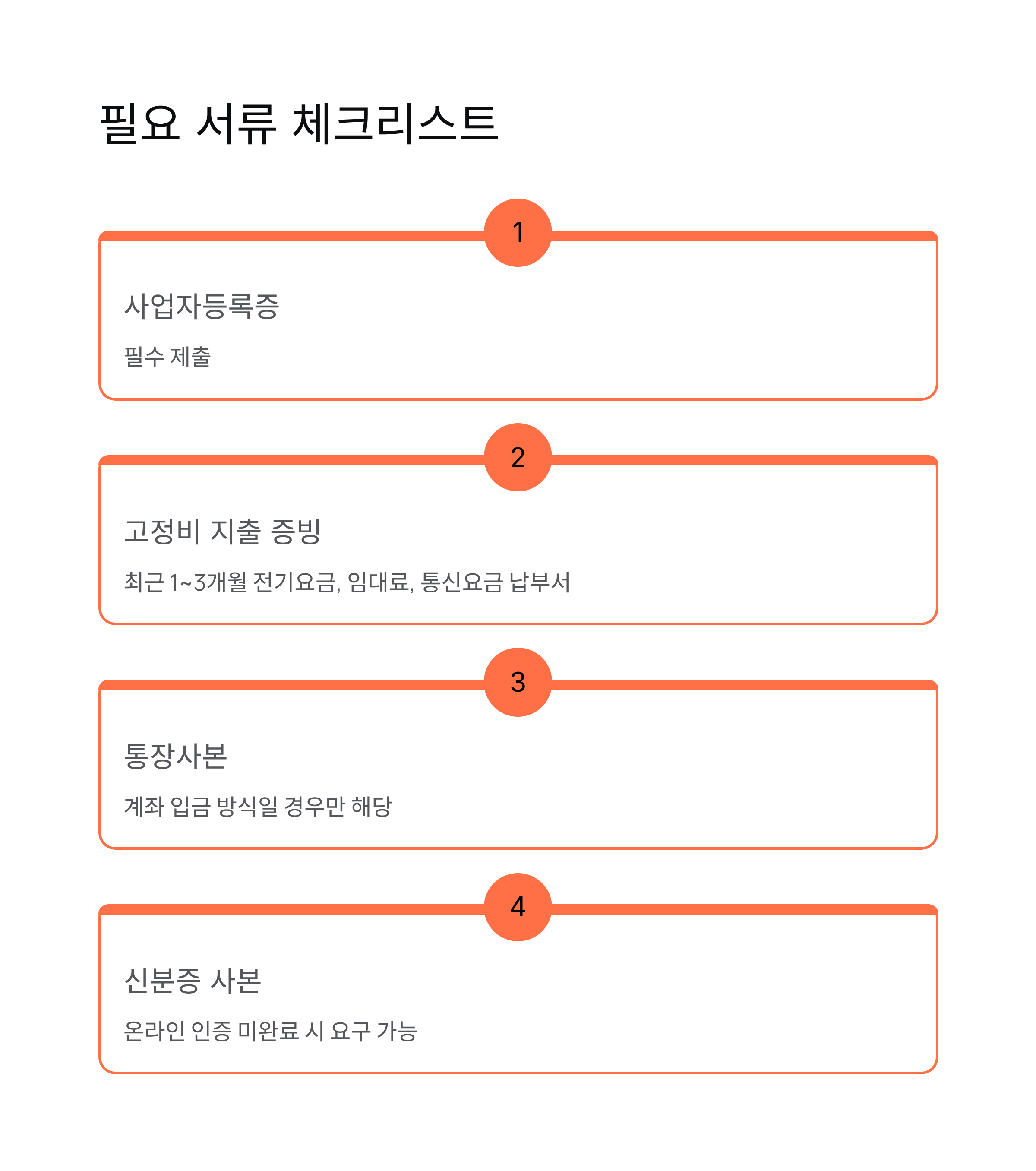 | 고정비 지출 증빙 | 최근 1~3개월 전기요금, 임대료, 통신요금 납부서 등 |