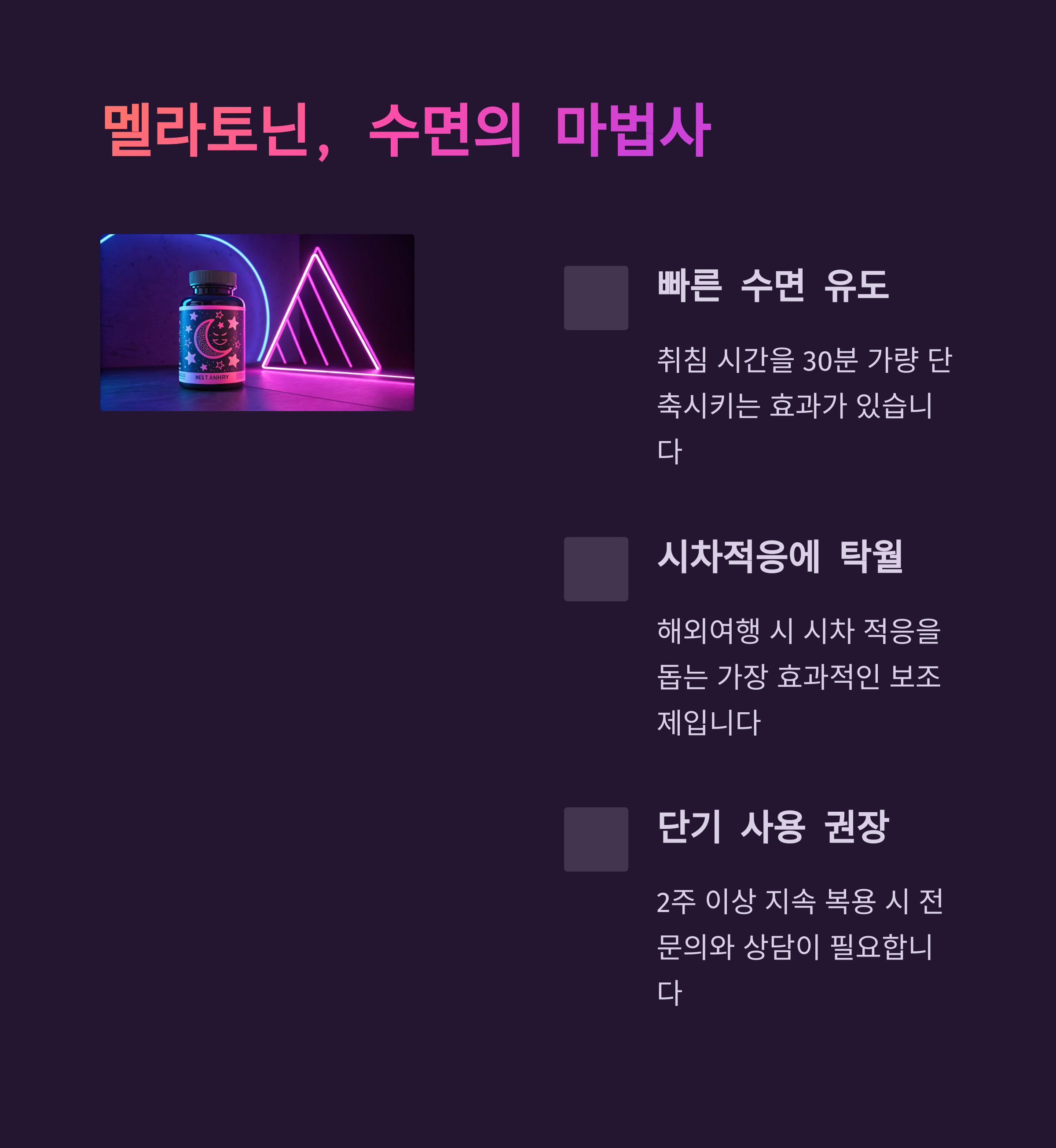 하지만 장기 복용 시 체내 자연 멜라토닌 생성이 방해받을 수 있어 주의해야 합니다.