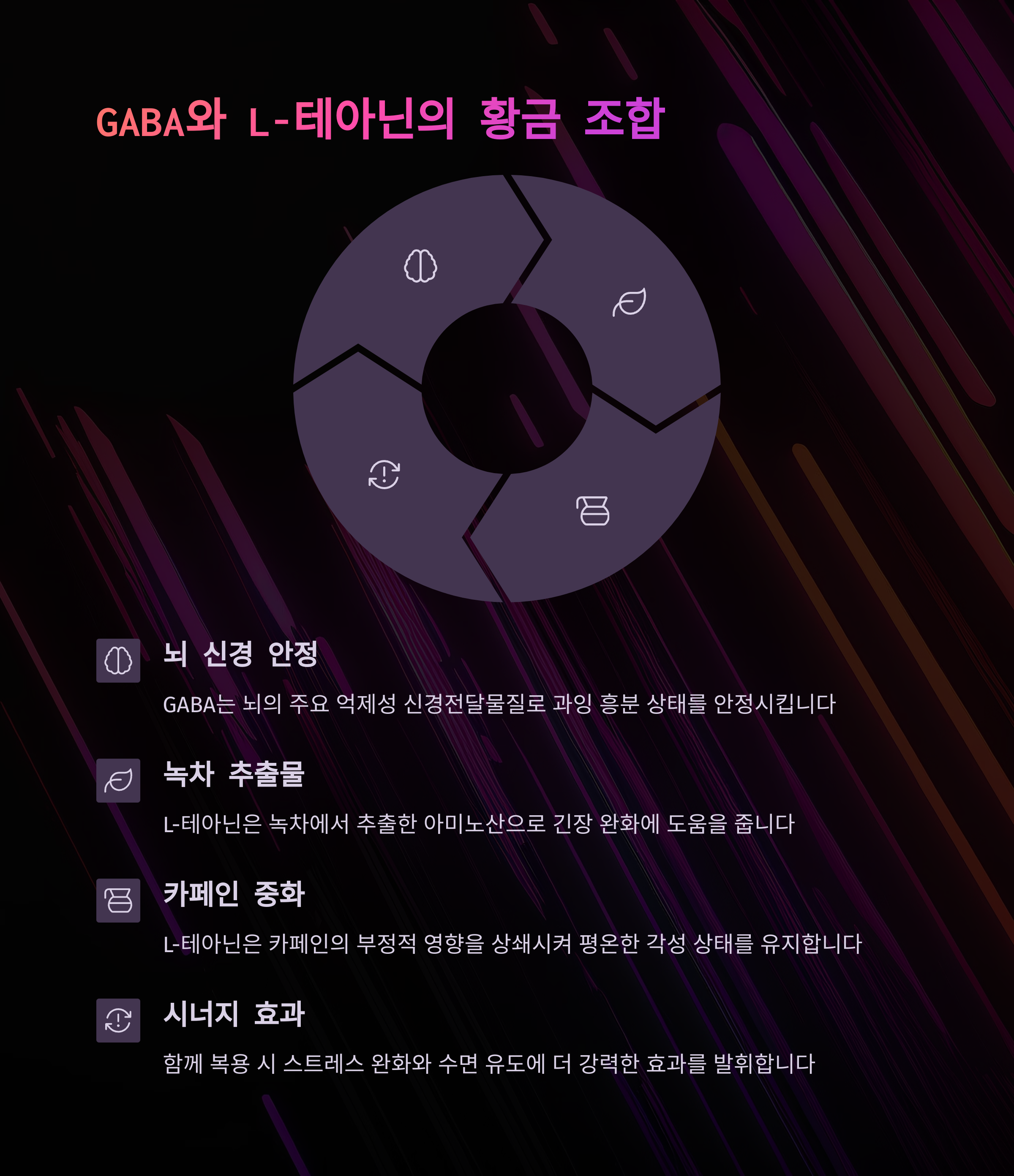 "GABA와 L-테아닌은 스트레스 완화와 마음 안정에 최적의 조합입니다."