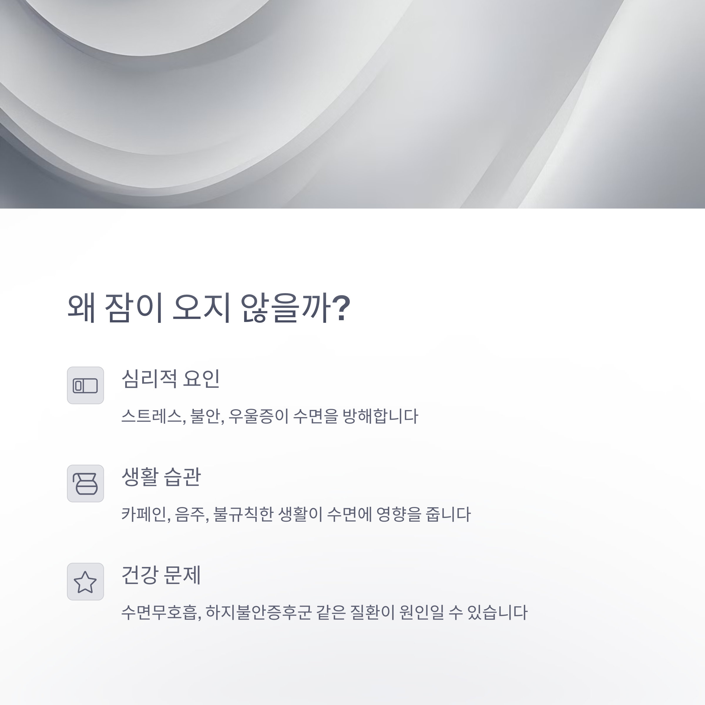 "스트레스, 불규칙한 생활습관, 스마트폰 사용, 영양 불균형 등이 수면을 방해합니다."