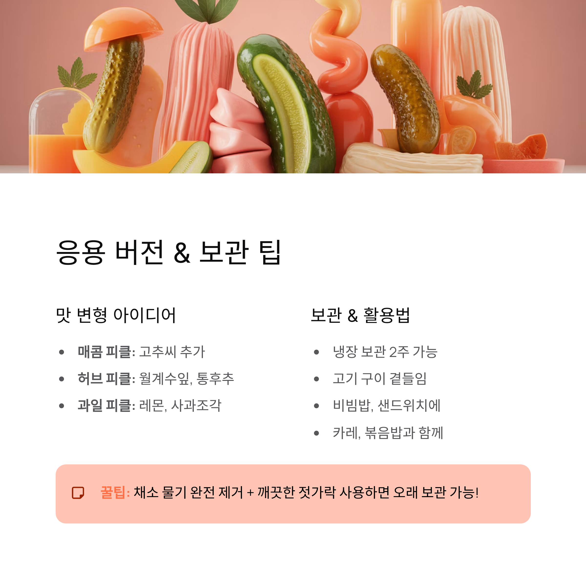| 매콤 피클 | 고추씨 1작은술 | 알싸하고 개운함 |