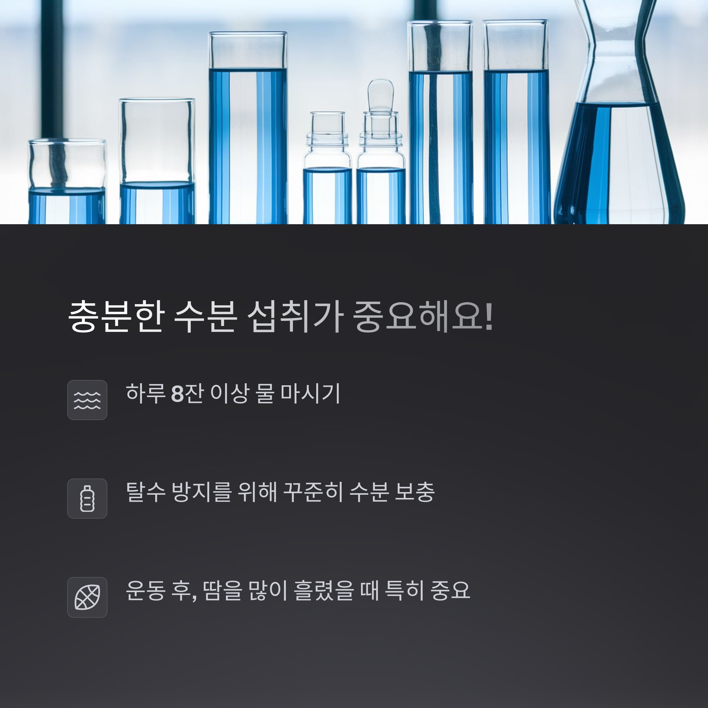 | 수분 섭취 | 영양 관리 | 생활 습관 |