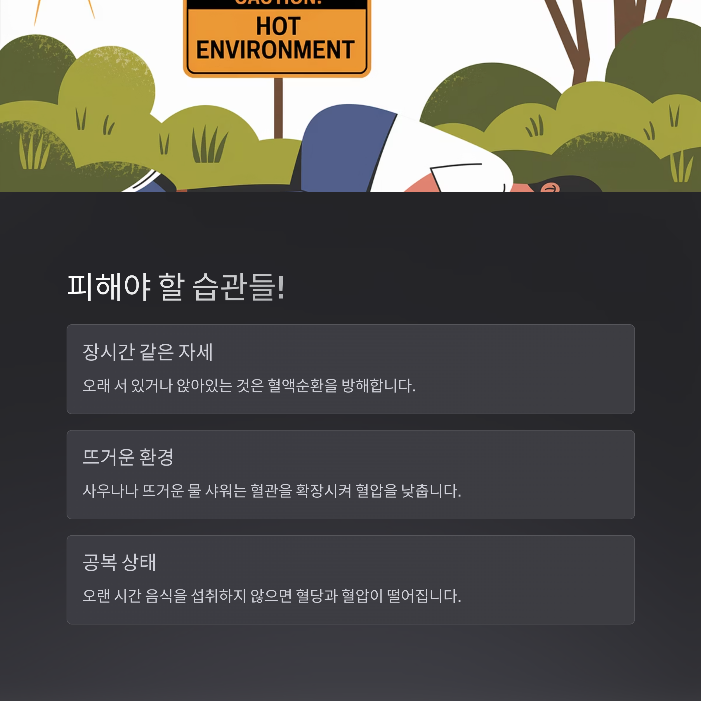 | 하루 6~8잔, 미지근한 물, 전해질 보충 | 철분, 단백질, 비타민B, 소식 다식 | 갑작스런 자세 변경 금지, 기상 시 천천히 |