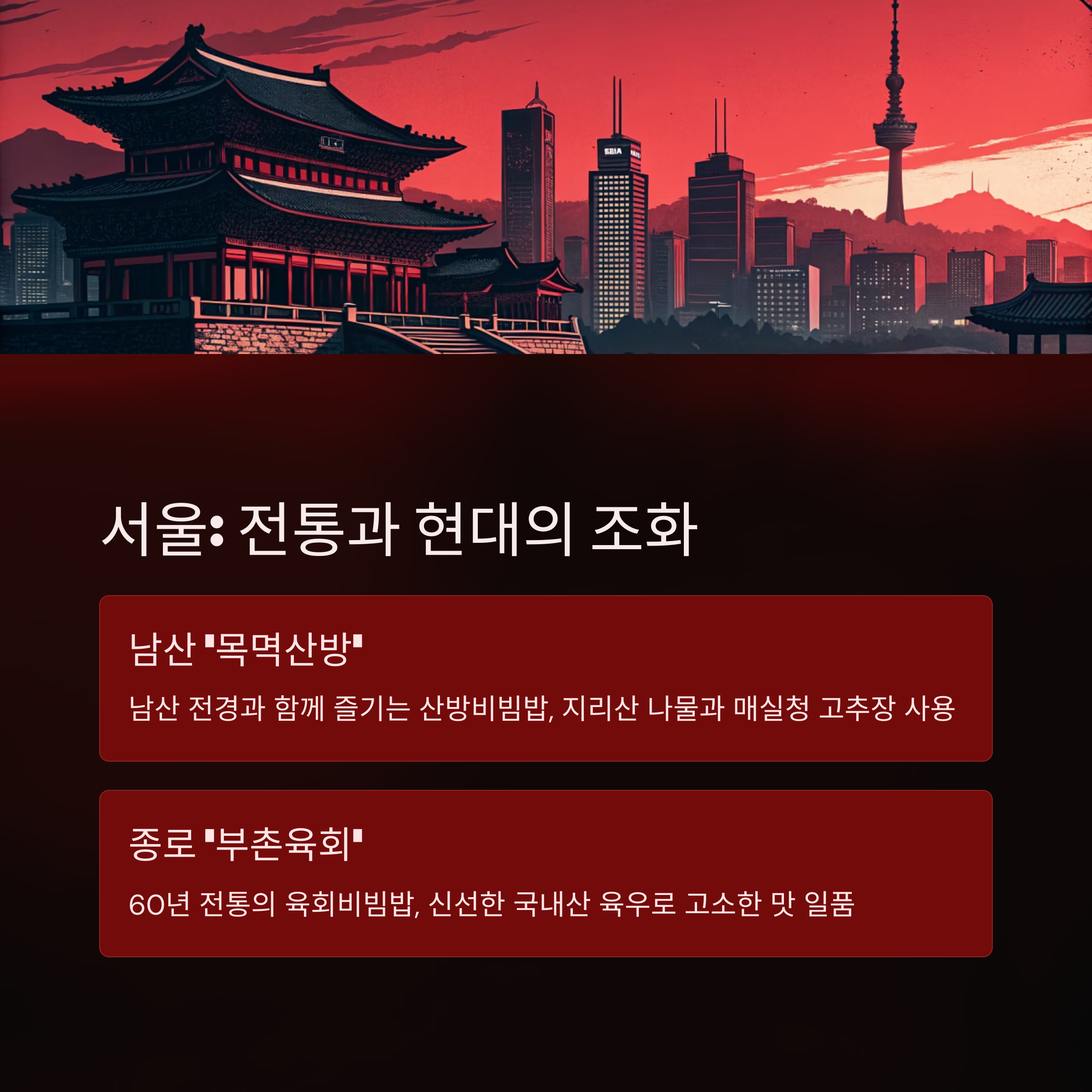 서울에서는 전통적인 비빔밥부터 현대적인 감각을 더한 비빔밥까지 다양한 스타일을 즐길 수 있습니다.