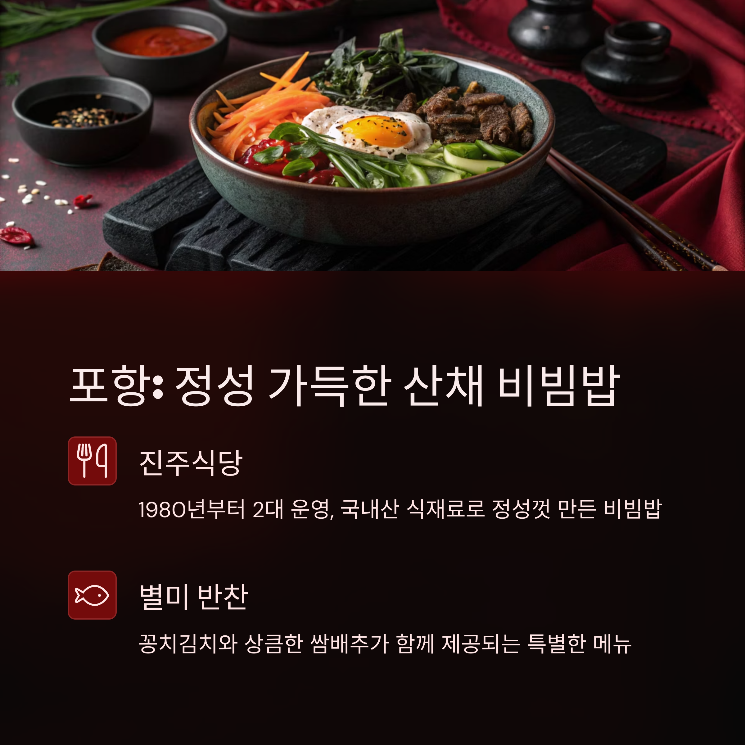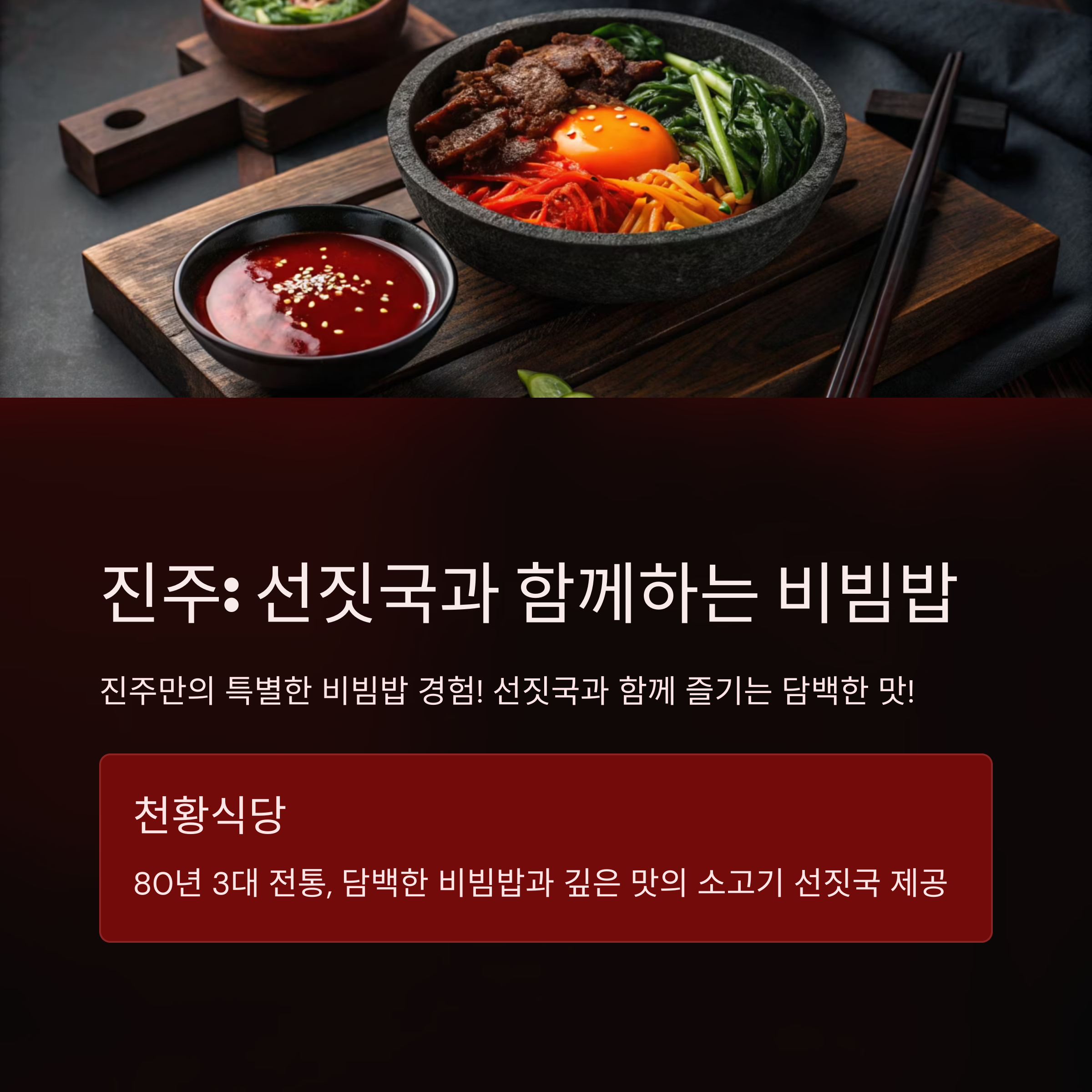 80여 년간 3대째 진주비빔밥을 이어오고 있는 곳으로, 비빔밥은 양념도 간도 강하지 않아 담백하며, 함께 제공되는 소고기 선짓국은 깊은 맛으로 유명합니다. (sorb.tistory.com)